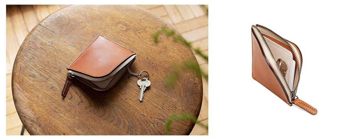 L字形ファスナー付きで、ちょっとした小物も入れられるパスケースです。大人向け鞄に用いる技術で制作し、細部まで美しく職人技を詰め込んでいます。