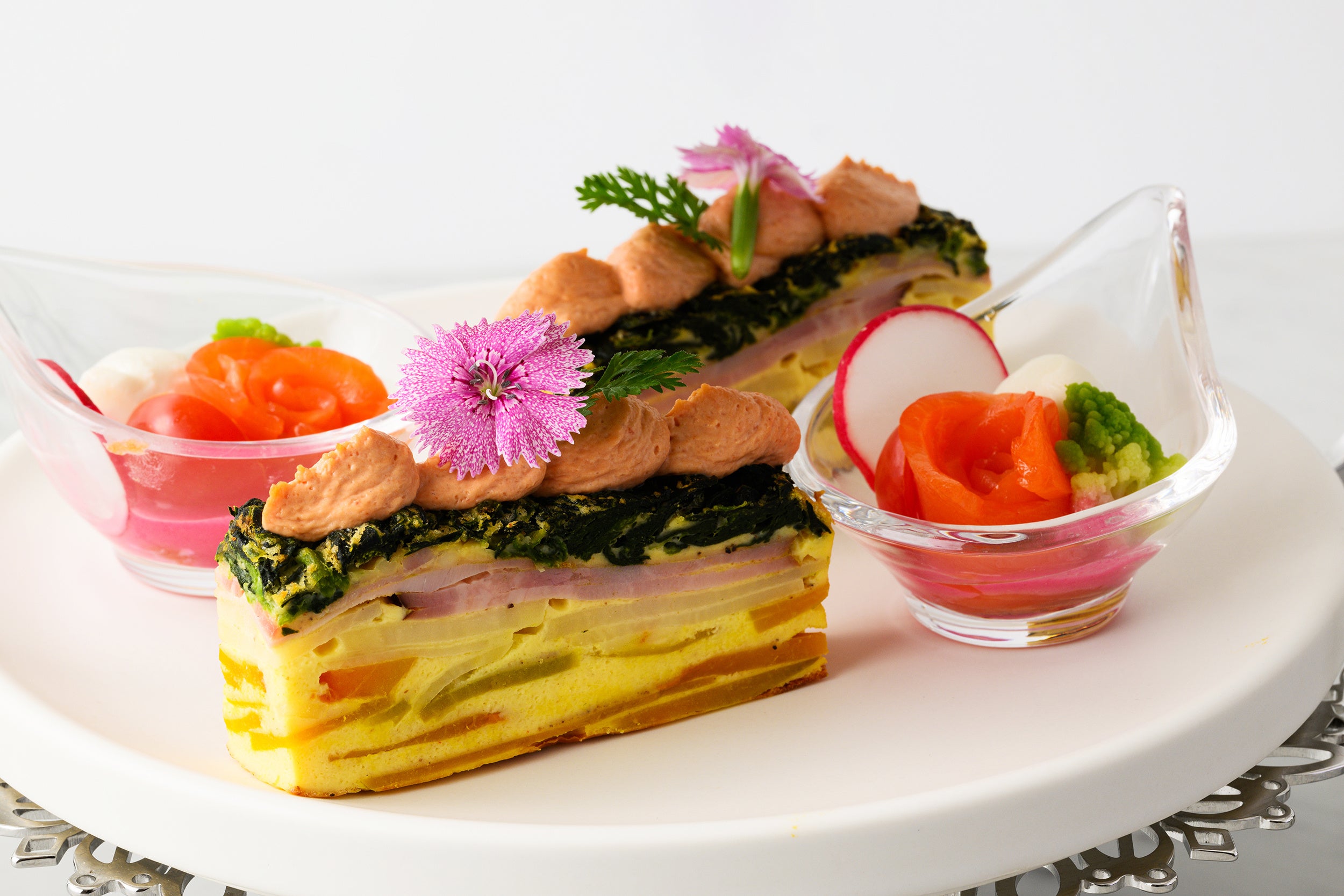 3段目:キッシュミルフィーユ、スモークサーモンとモッツァレラ ビーツのカクテル