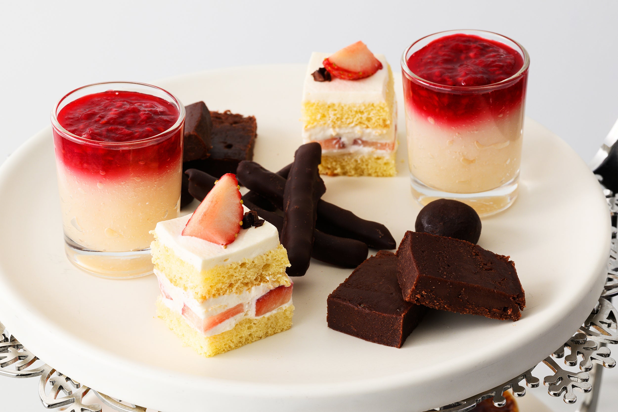 1段目には、「アニヴェルセル 表参道」でしか味わえないコラボレーション限定のカカオニブショートケーキや、エンローブドシトラスをはじめ、ガトーショコラやカカオパルプジュレなどダンデライオン・チョコレートを贅沢にお楽しみいただけます。2段目には、アニヴェルセルで大好評のクレームブリュレやフィナンシェなどのスイーツ、3段目には、セイボリーとしてスモークサーモンとモッツァレラのカクテル、キッシュミルフィーユをご用意いたしました。コーヒー、紅茶をはじめとした20種のドリンクをフリーフローでお楽しみいただきながら、ゆったりとした時間をお過ごしください。