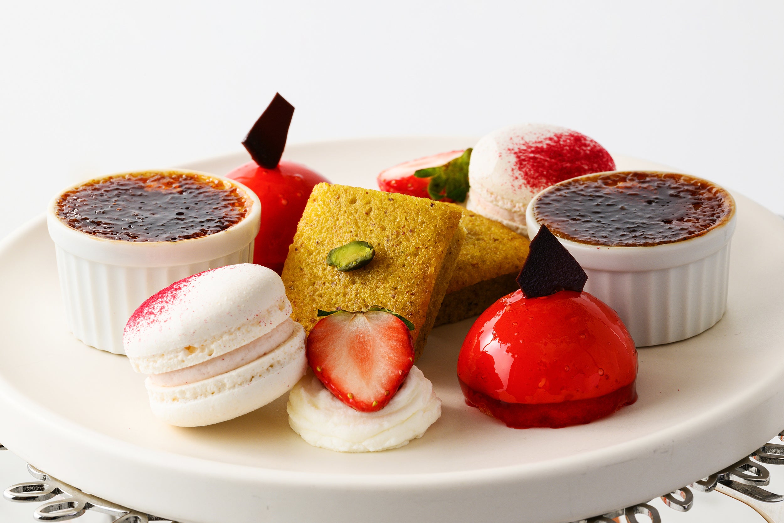 2段目:クレームブリュレ、チーズとローズヒップのムース、いちごのマカロン、苺&生クリーム、ピスタチオフィナンシェ