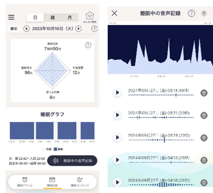 自分では自覚していない睡眠中の音声(いびきや寝室環境の騒音)を記録します。就寝中の音量が大きかった10件を表示し、現在の睡眠環境を知ることに繋げます。