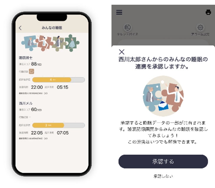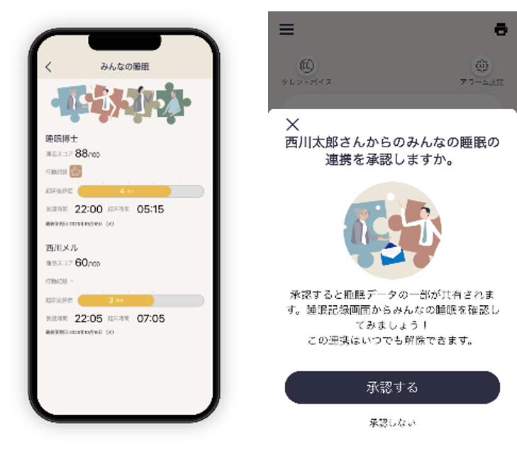 連携相手と睡眠のデータを共有します。「遠方にすむ祖父母の体調が心配」「よく遊ぶ友人の睡眠スコアが気になる」「上京して一人暮らしを始めた息子は元気かな・・・?」 など、遠方の家族や友人はもちろん同居のご家族同士でも体調の変化に気づくきっかけや、コミュニケーションの糸口としてご利用いただけます。
