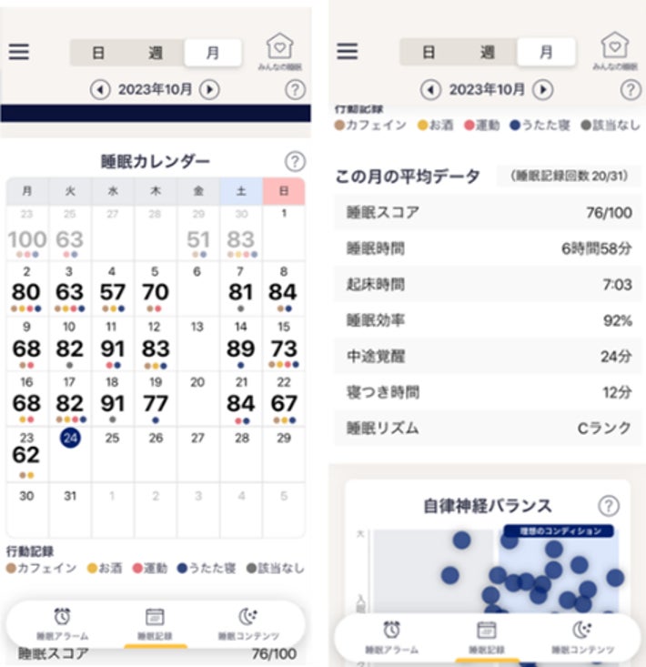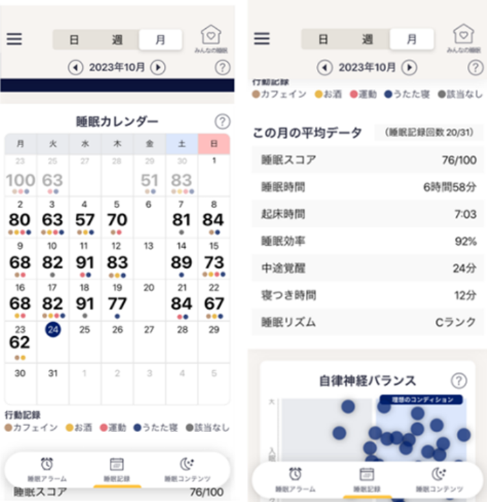 睡眠時間、寝つき時間、中途覚醒、睡眠効率の4項目に基づき100点満点でスコアを算出します。このスコアと行動記録をもとに、眠りの特徴や改善のためのアドバイスをお伝えします。