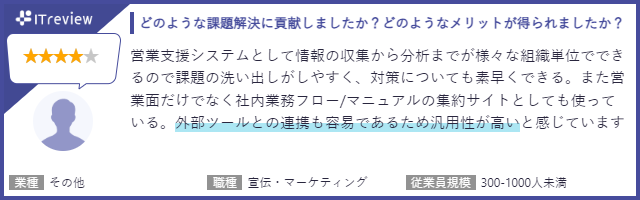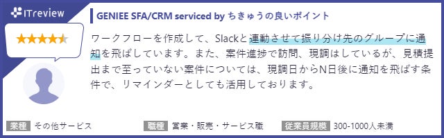 今回の「ITreview Grid Award 2024 Winter」は2023年12月までに掲載されたレビューの集計結果をもとに選定され、「GENIEE SFA/CRM」には外出先でも簡単に使うことのできるアプリ機能や、外部ツールとの連携に対する高評価のコメントが多く寄せられました。