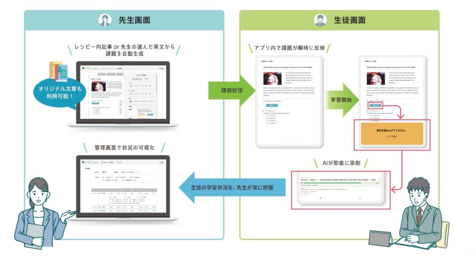 『レシピー for School』内のさまざまなニュース記事や先生の選んだ文章を入力するだけで、授業や宿題に活用できる単語や内容理解の問題、ライティング・スピーキングの問題をAIが自動で生成します。答案の採点やフィードバックもAIが行うため、問題作成から採点、生徒の成績管理までがアプリ内で完結します。