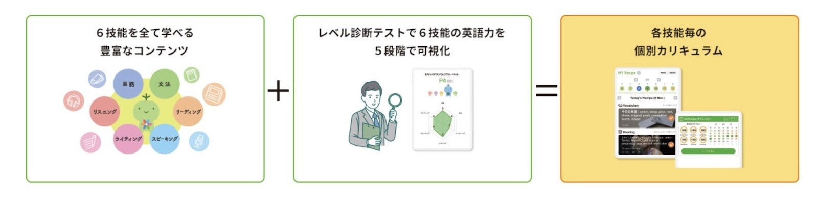 AIが自動で毎日の学習カリキュラムを作成する機能です。AIが自動生成したアプリ内のテストで、単語・リスニング・文法・リーディング・スピーキングの各技能を5段階にレベル分けします。生徒一人ひとりのレベルや学習時間に合わせて、毎日オリジナルのカリキュラムを配信することで、生徒が自主的に、必要な学習に取り組めるようになります。
