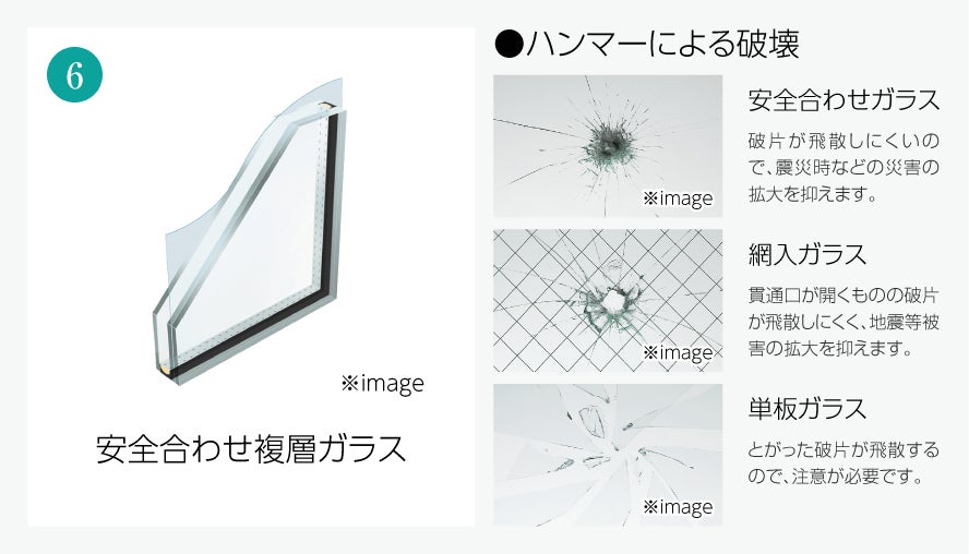 1階の全窓と2階の掃き出し窓に、安全合わせ複層ガラスを採用。複層ガラスよりも破壊されにくい構造で、“こじ破り”にも高い防犯効果を発揮します。