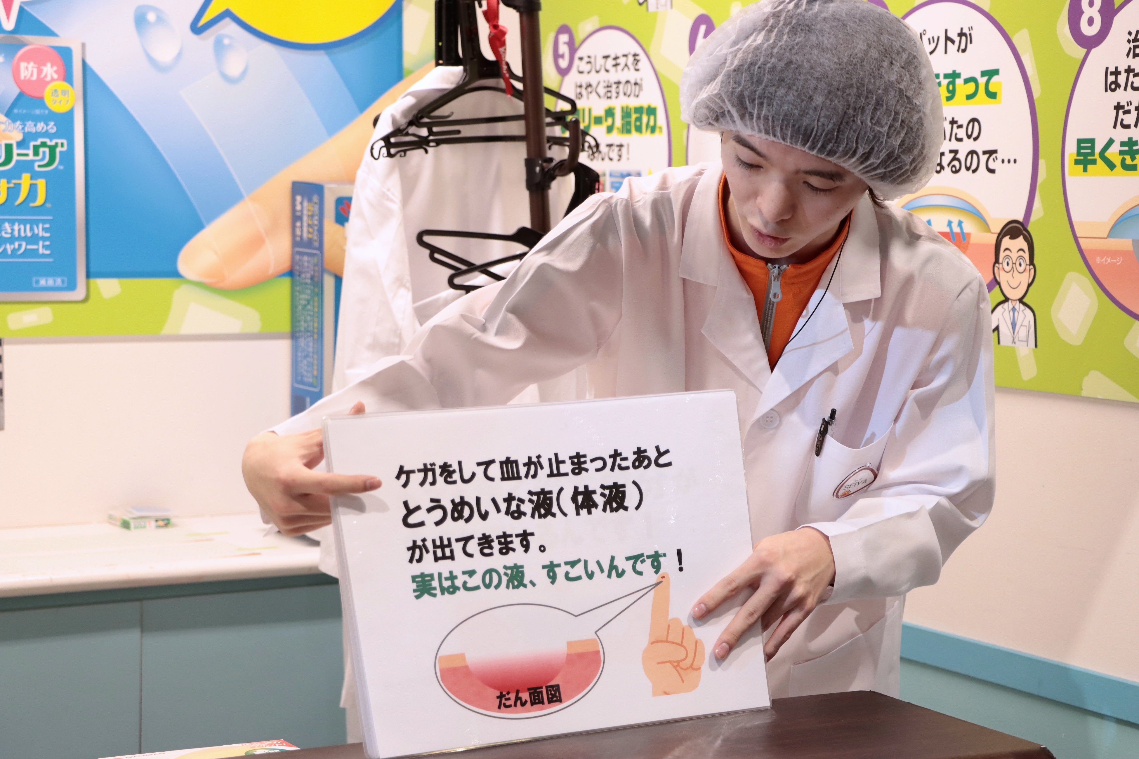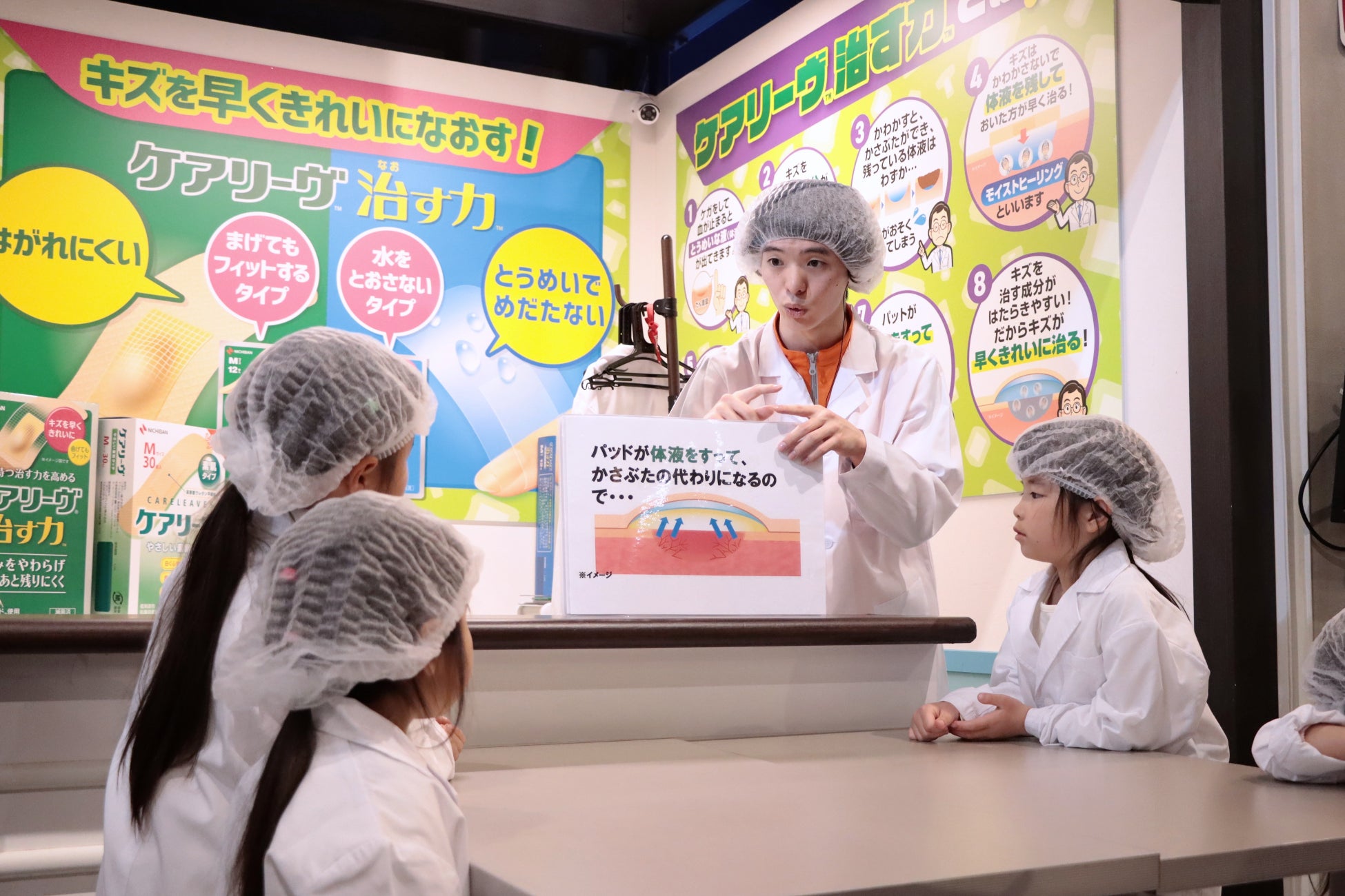 子どもたちがニチバン研究員となって、スタッフとともにキズが早く治る仕組みや応急処置について学びながら、ケアリーヴ(TM)の実際の部材に触れていただき、特長を知っていただく機会となりました。
