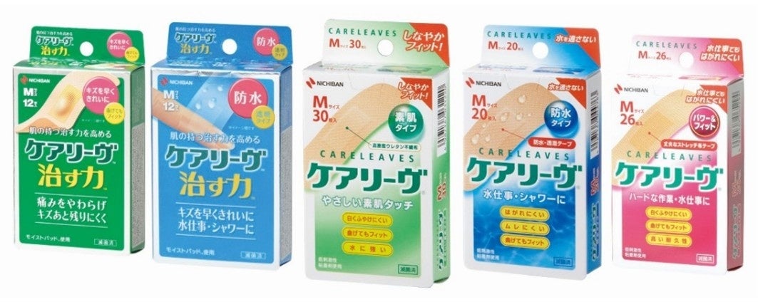 ニチバンは1997年に「肌へのやさしさ」と「フィット感」を兼ね備えた「ケアリーヴ(TM)」を発売しました。柔らかく通気性に優れた高密度ウレタン不織布素材の救急絆創膏です。スタンダードな「ケアリーヴ(TM)」のほか、防水性に優れた「ケアリーヴ(TM)防水タイプ」、丈夫なストレッチ布テープを採用した「ケアリーヴ(TM)パワー&フィット」、大きなキズもしっかりカバーできるシリーズ最大サイズ「ケアリーヴ(TM)超大判」、楽しく貼れるジュニアサイズの「ケアリーヴ(TM)キャラクター」があります。ケアリーヴ(TM)シリーズは多くのお客様にご愛用いただいており、絆創膏市場において3年連続売上数量No.1※を獲得しています。