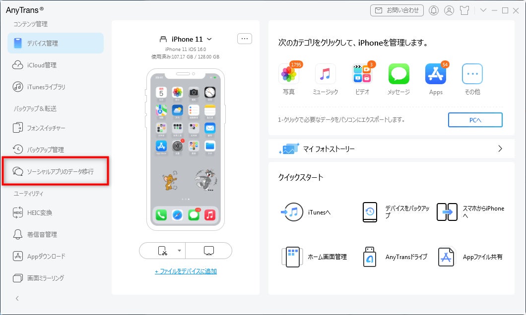 Step2、AnyTransを起動して、USBケーブルでiPhoneをパソコンと接続すると、デバイスが検出されます。左側のメニューから「ソーシャルアプリのデータ移行」機能をクリックします。