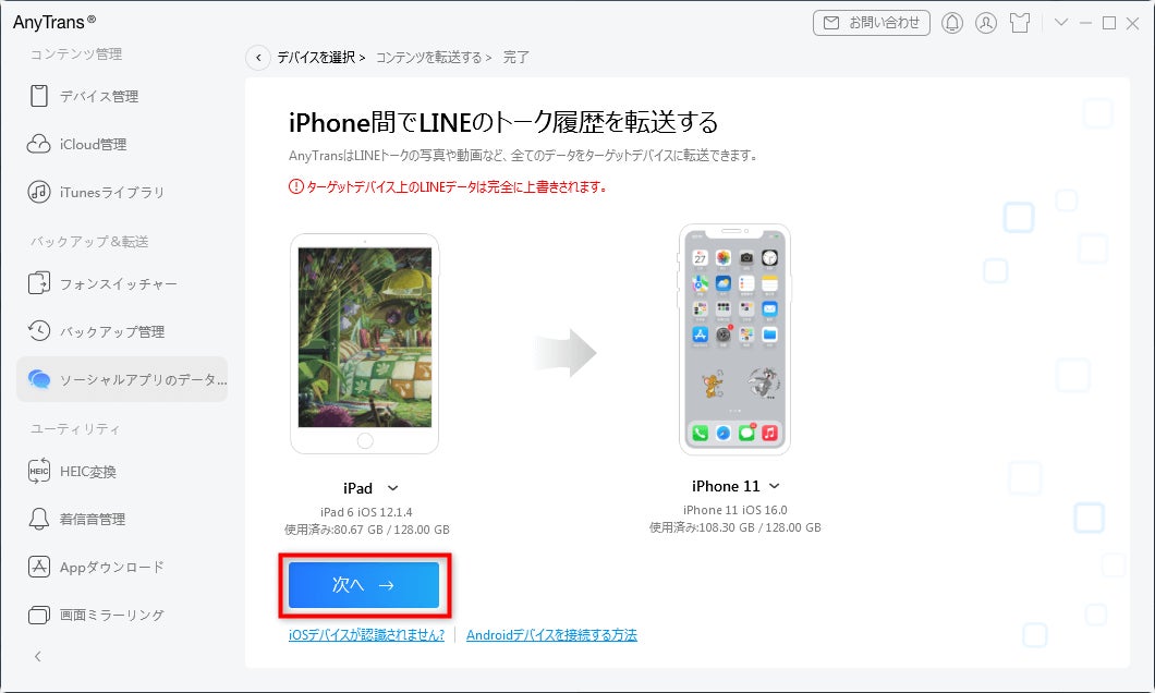 AnyTransはiOSマネージャーの専門ツールとしてLINEのトーク履歴、写真や動画を含む多種類のデータを自由にコンピュータにバックアップできます。バックアップのみならず、iPadでLINEのトーク履歴の復元・引き継ぎもできるのです。