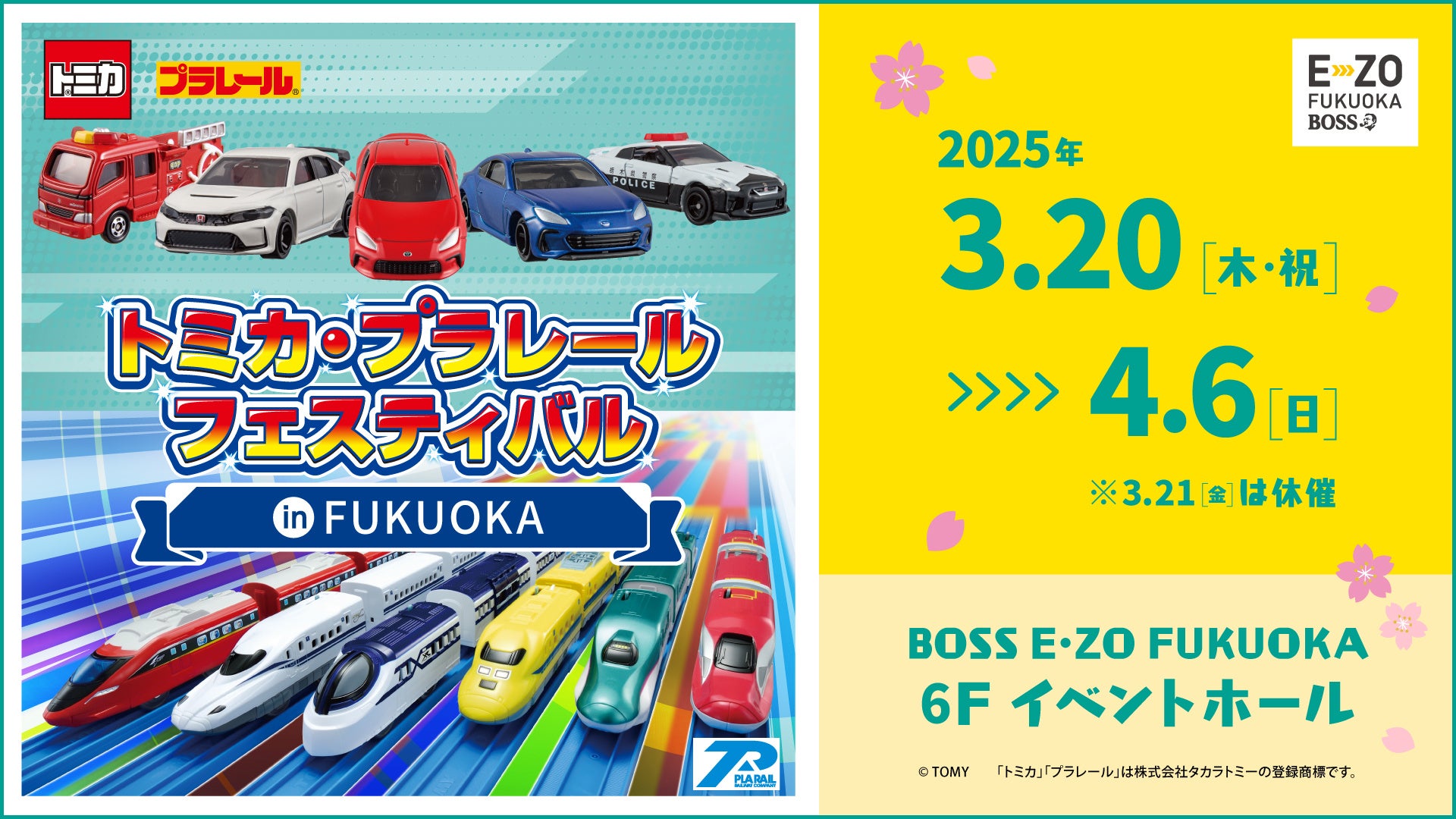 みんな大好きトミカとプラレールがBOSS E・ZO FUKUOKAにやってくる!トミカとプラレールがいっしょに楽しめるイベント「トミカ・プラレールフェスティバル」が2025年3月20日(木・祝)~4月6日(日)、BOSS E・ZO FUKUOKAにて期間限定で開催します!「トミカ・プラレール巨大ジオラマ」など大迫力の展示ゾーンに加え、アトラクションゾーンでは大人気の「トミカ組立工場」「プラレールあみだくじ」が登場!「トミカ・プラレールマーケット」ではイベント記念商品など充実のラインナップでお待ちしています。