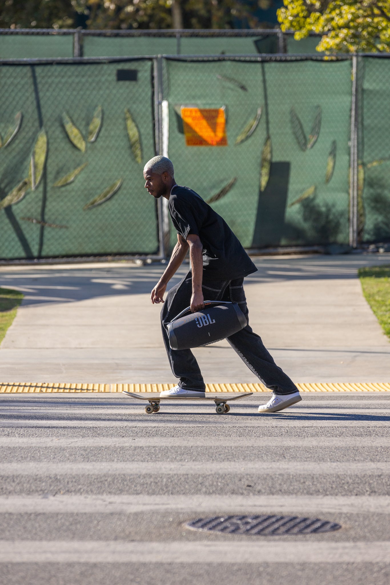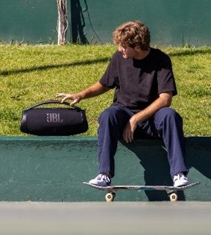 また、筐体デザインもさらにブラッシュアップし、流線形が強調されたシルエットに仕上がりました。「BOOMBOX」シリーズを印象付ける大きなハンドル部分は、樹脂製からアルミニウム製に刷新したことで高級感が増し、握った際の手馴染みの良さも向上しています。ハンドルの内側には滑り止めシリコンラバーもあしらっているため、持ち運びの際も安心です。本体正面のブランドロゴも「JBLボールドデザイン」にリニューアルし、筐体とロゴのカラートーンを併せる「TONE on TONE(トーンオントーン)」を採用したことで、より存在感のある外観にアップグレードしています。