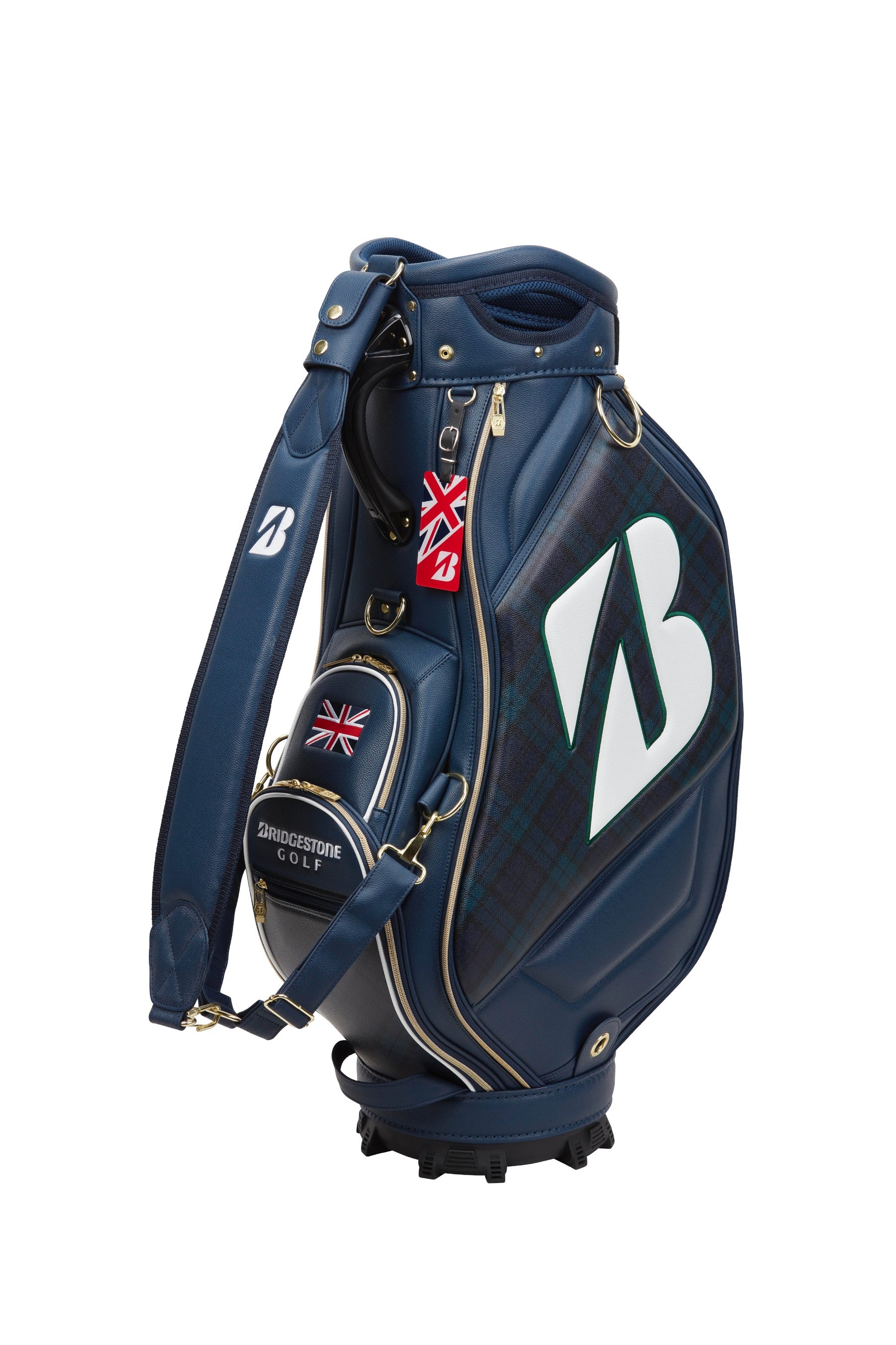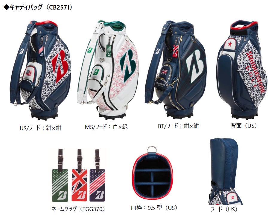今季のキャディバッグ(CB2571)は、MS色はアザレアの花柄、US色は星柄グラフィック、BT色は英国らしいチェック柄をデザインに取り入れました。機能面は、持ち運びに便利な口枠部分のハンドルや、担ぐ際の安定性を確保する3点式のショルダーベルト、便利なグローブホルダーなど、プレーヤーの視点に立った機能が搭載されています。