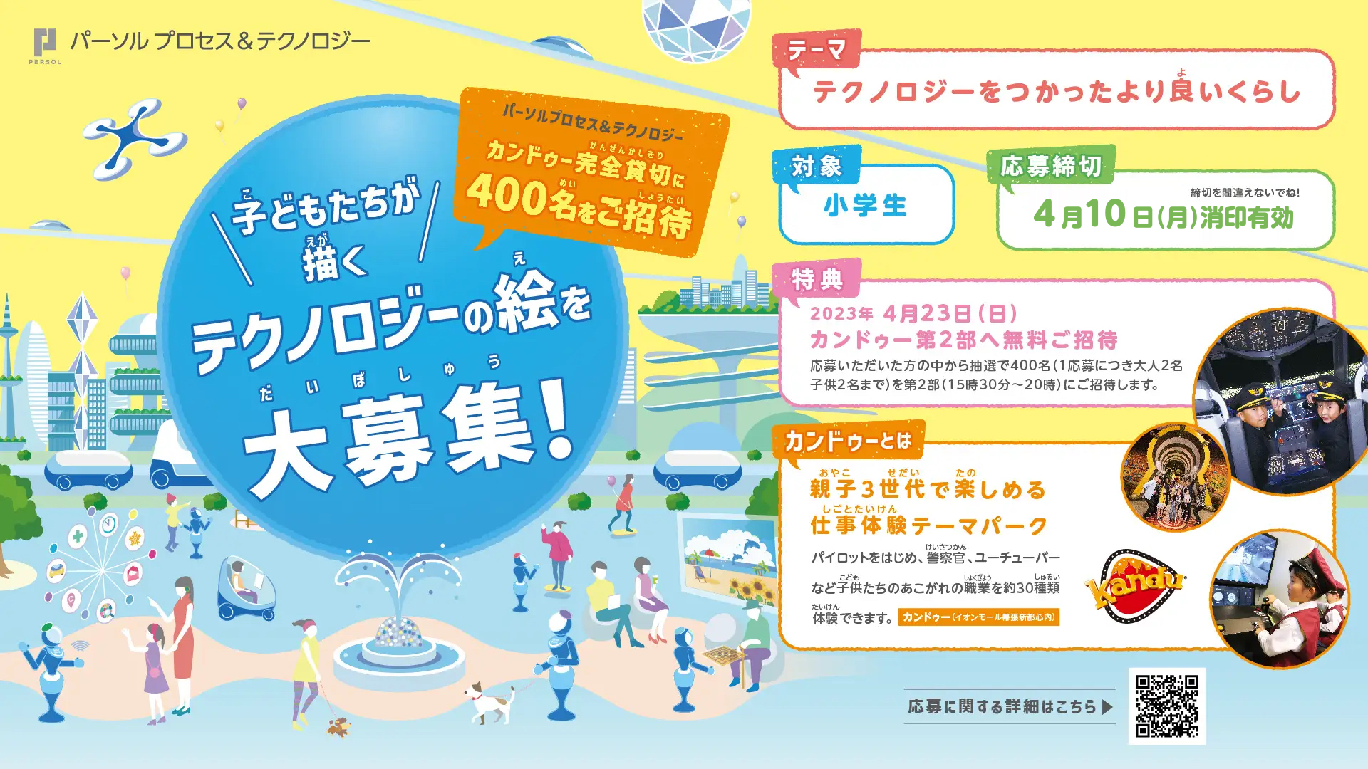 本企画は、小学生を対象に「テクノロジーをつかったより良いくらし」を自由な発想で描いて応募いただき、応募者の中から抽選で400名(1応募につき大人2名子供2名まで)を2023年4月23日(日)当社完全貸切のカンドゥー第2部(15時30分~20時)に無料でご招待します。