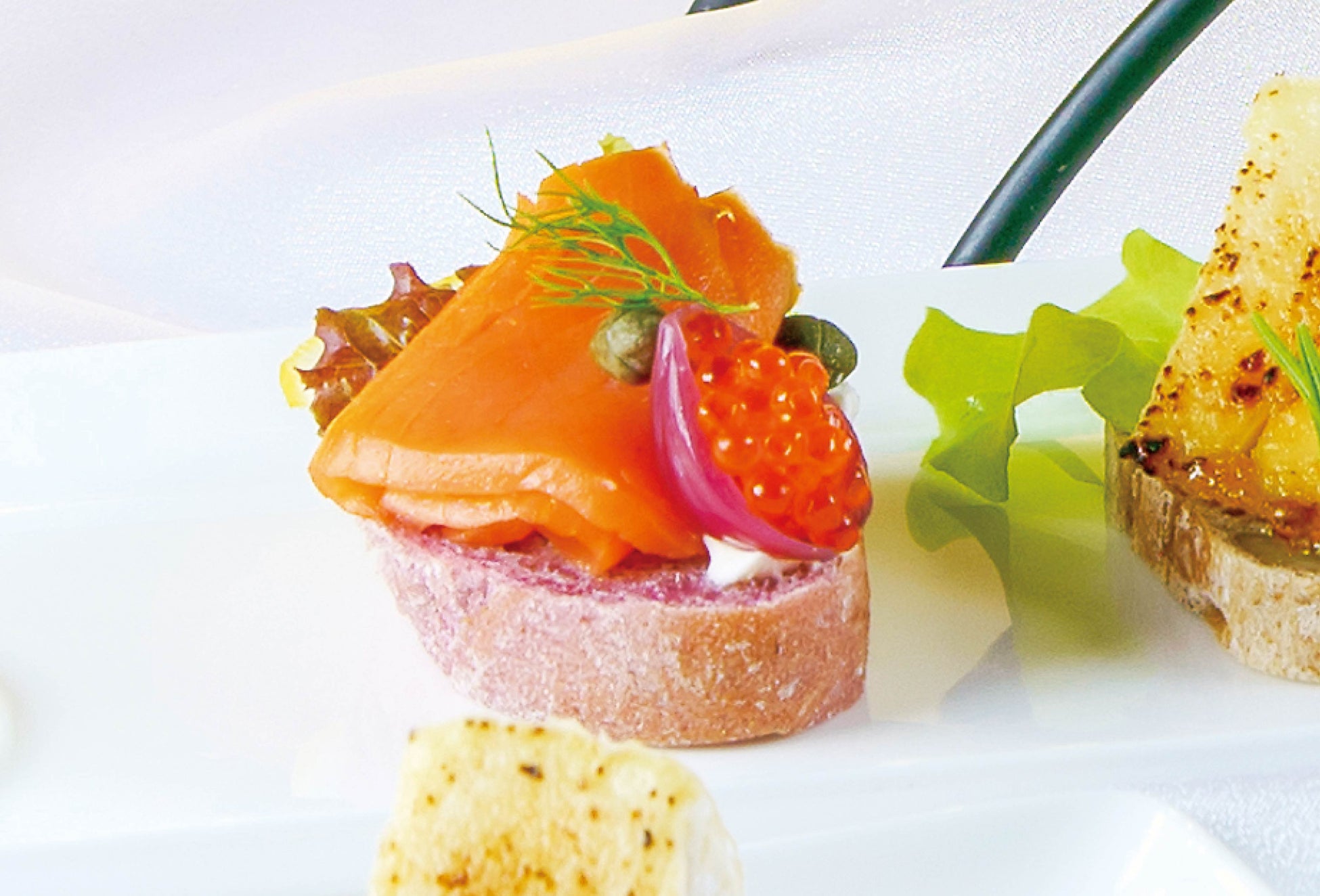 その他、セイボリーには北欧の伝統的なオープンサンド「スモークサーモン&フレンチキャビアのスモーブロー」など一口サイズで楽しめる贅沢なラインアップをご用意しました。