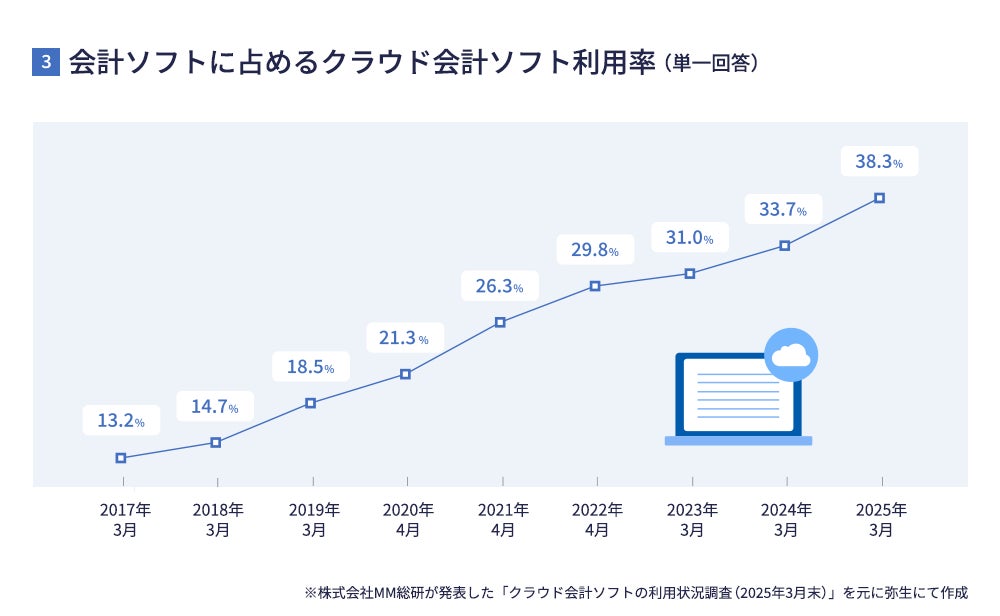 「クラウド会計ソフトの利用状況調査(2025年3月末)」によると、会計ソフト利用者に占めるクラウド利用率は今回の調査において38.3%に拡大し、前年と比較し、4.6ポイント増と拡大基調が強まりました。