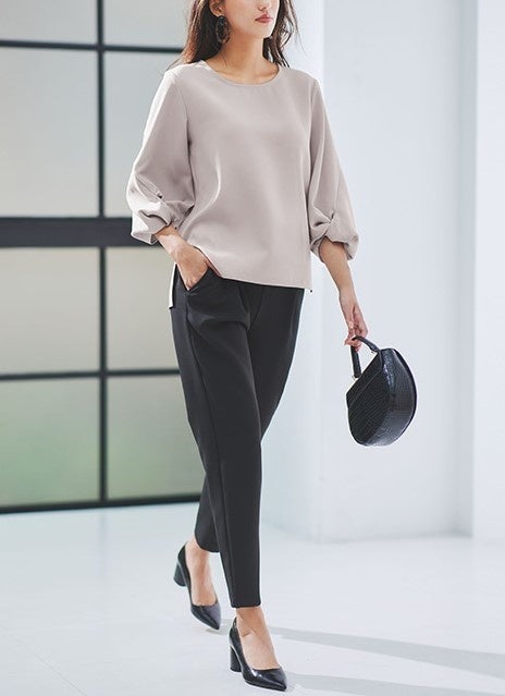 ■特長:可愛らしいつぼみ袖と美脚見えパンツが特長のセットアップ。シンプルな大人可愛いデザインで、どんなシーンにもピッタリな優れもの。服選びを迷いがちな朝の時短にもつながる万能アイテムです。