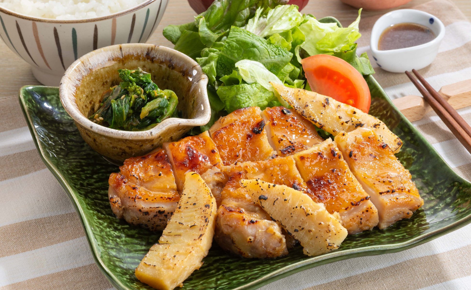 鶏もも肉と筍の麦みそ漬け炭火焼き