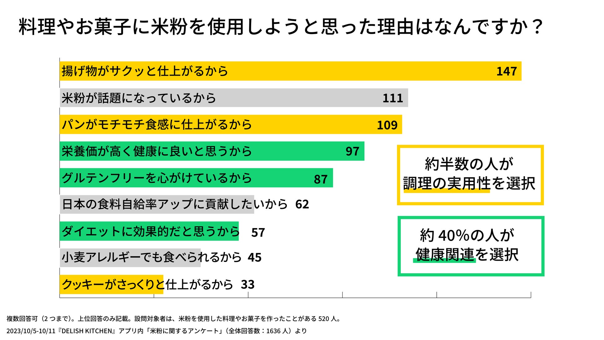 一方、「揚げ物がサクッと仕上がる」「パンがモチモチ食感に仕上がる」「クッキーがさっくりと仕上がる」といった調理での実用性を理由に挙げた人も約半数を占め、主に健康と実用性の2つの観点から米粉が選ばれていることが分かりました。