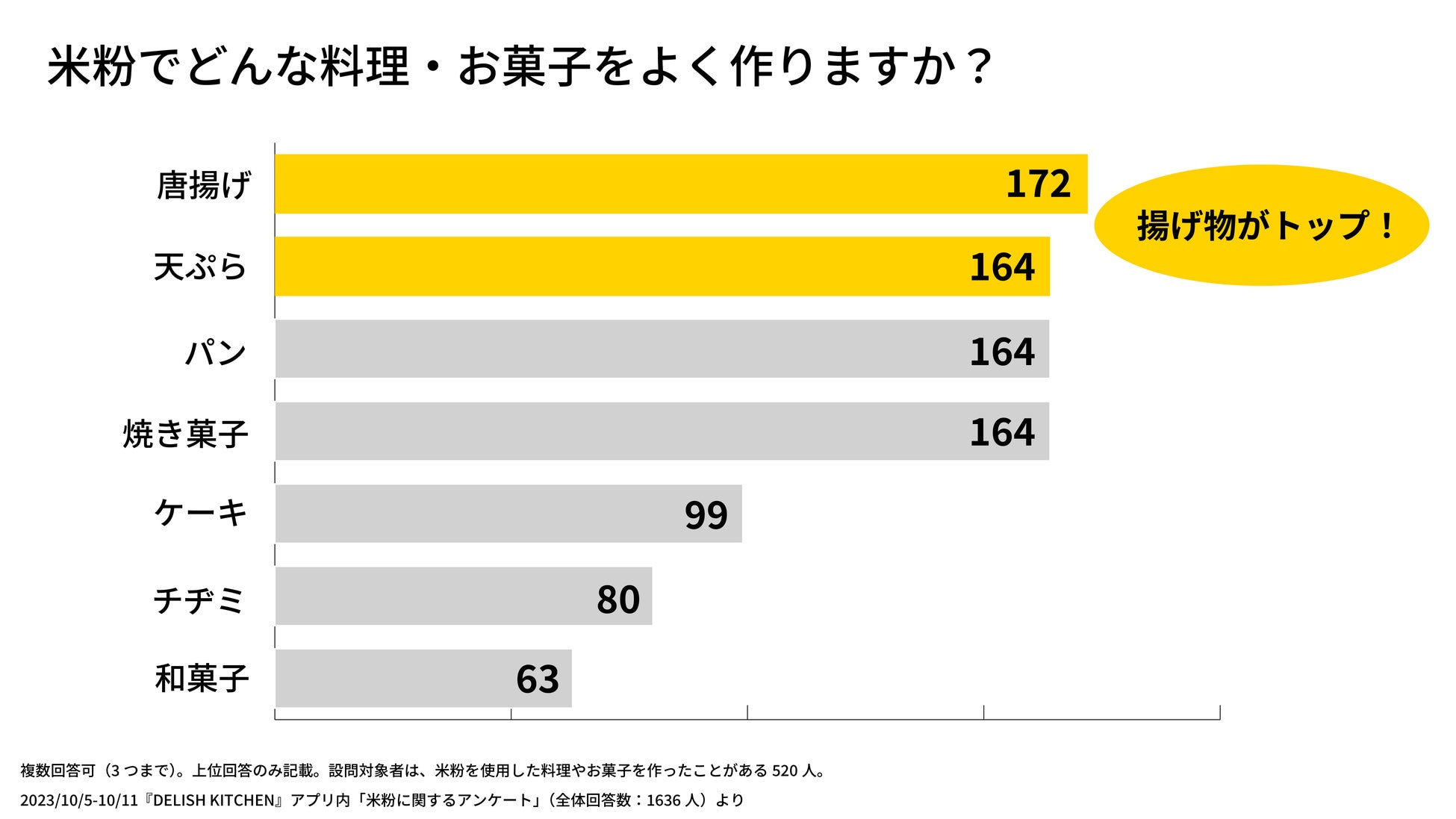 米粉でどんな料理・お菓子をよく作るかを聞いた設問では、トップは「唐揚げ」、2位に「天ぷら」「パン」「焼き菓子」が続きました。米粉は、小麦粉に比べて吸油率が低いので、揚げ物に使うと冷めてもサクサク感が長く続き、さっぱりヘルシーに仕上がる特徴があります。サクッと仕上がる実用性と、油を抑えられるヘルシーさの両面から、揚げ物に米粉を活用する人が多いことが推察できます。