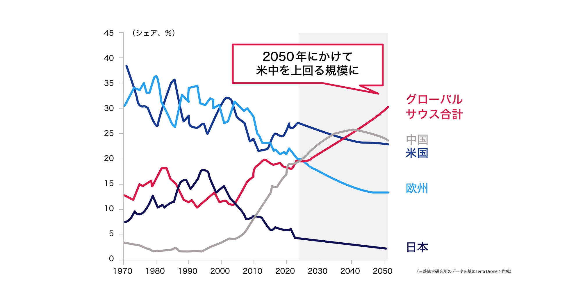 ウクライナ情勢などを受け、グローバルサウス諸国の存在感が高まるなか、日本政府も連携強化に向けた方針について議論を進めています(※2)。また、三菱総合研究所のレポートによりますと、経済面において、2050年にかけて名目GDPの合計が米国や中国を上回る規模にまで急拡大すると見込まれています(図表1)。