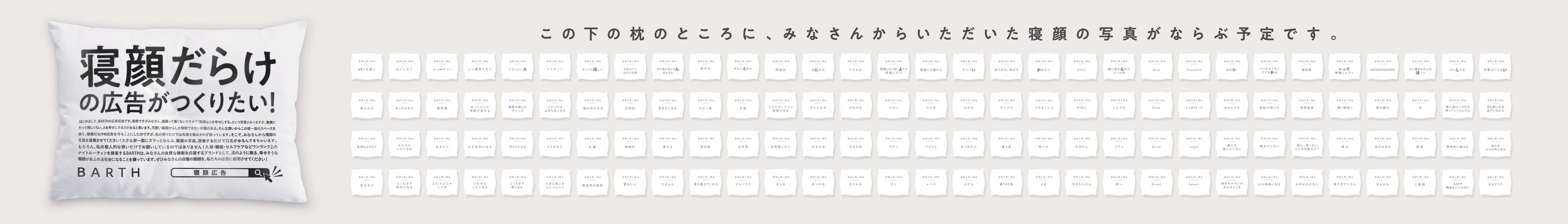 BARTH広告担当念願の寝顔だらけの広告をつくるため、皆様から「寝顔写真」を募集します。老若男女、ヒト・動物問わず、あなたを撮影したもしくはあなたが撮影した“とっておきの寝顔”を、ぜひともBARTHの広告に起用させてください!