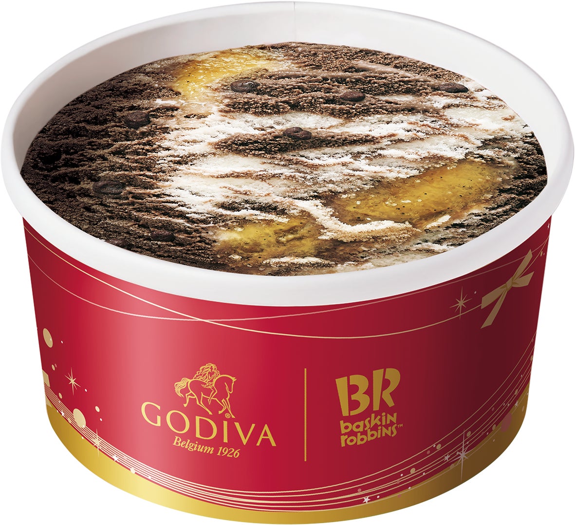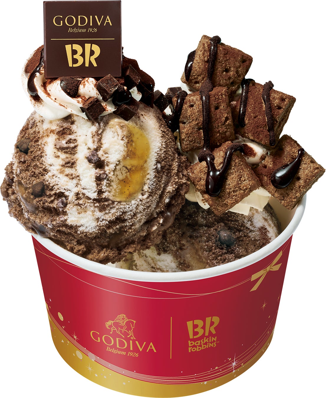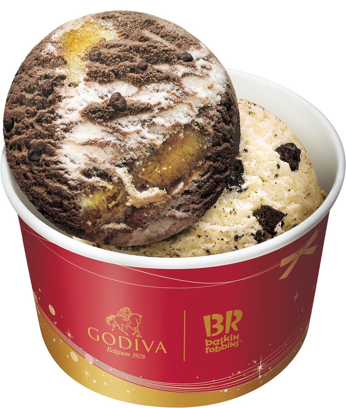2種類のチョコレートと芳醇な香りのバニラリボンが三位一体になったおいしさで、見た目もクリスマスにぴったり!ゴディバとサーティワンの自信作です。