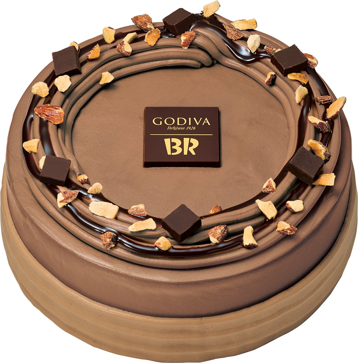 「- ゴディバ監修 - マリアージュ デュ ショコラ」がエレガントなアイスクリームケーキになりました。アイスクリームをライトブラウンとダークブラウンの2色のチョコレートホイップでデコレーションし、アーモンドやハイカカオチョコレート、チョコレートソースをトッピングし、ロゴ入りチョコレートを飾りました。