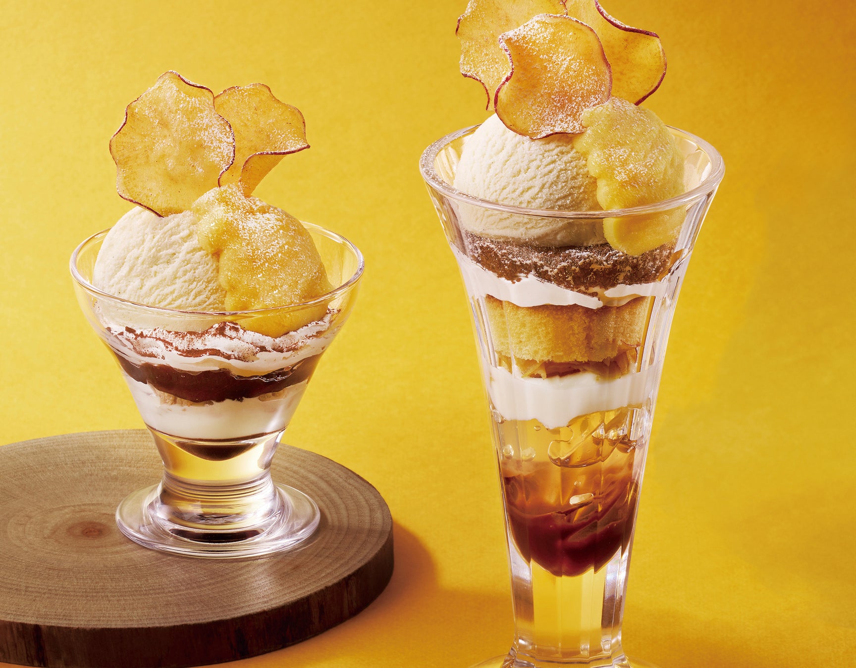 (画像右)濃厚なスイートポテト&フロマージュと林檎ゼリーのみずみずしい蜜感がコラボする「濃密パフェ」。さつまいもチップのアクセントも◎