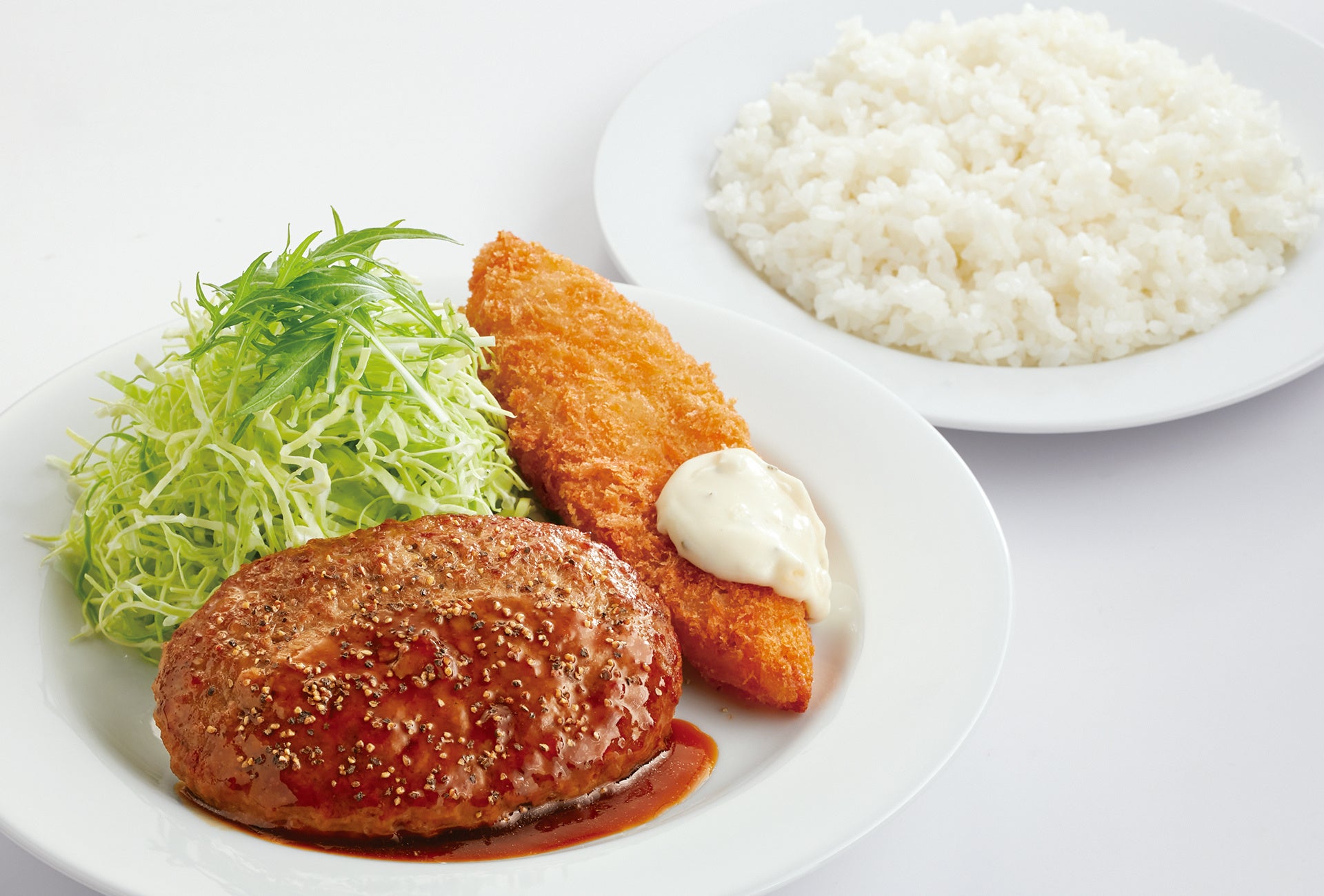 <NEW!>ワンコイン!日替りランチ・土曜日「ハンバーグ&白身フライ」/455円(税込500円)