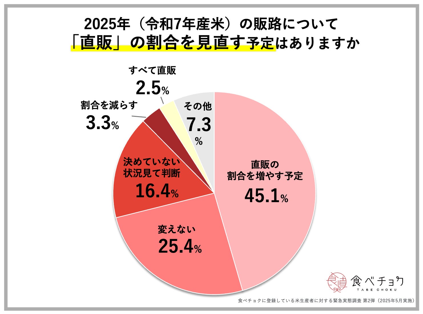 令和7年産米について、直販を増やす予定の生産者は45.1%に上ることがわかりました。その内約66%は食べチョクなどの産直通販サイトへの販売割合を増加する予定であると回答しました。次いで大手ECサイトや自社ECサイト、直売所などへの販売割合の増加を検討している生産者が多い状況です。
