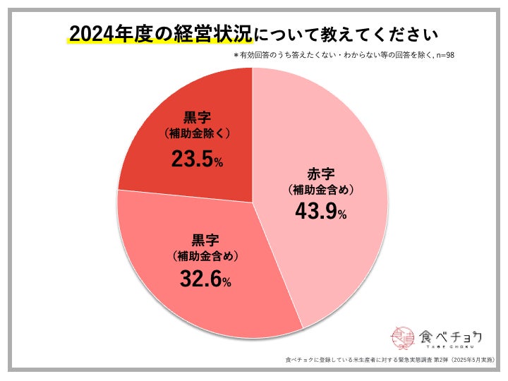 2024年の経営状況について、43.9%が「補助金を含めても赤字」、32.6%が「補助金を含めると黒字」、23.5%が「補助金を除いて黒字」と回答しました(有効回答のうち答えたくない・わからない等の回答を除いたn=98)。