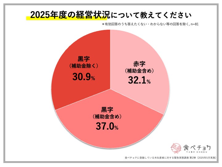 一方で、2025年の経営状況については、補助金を含めて「赤字」と回答する生産者は32.1%と減少しています。一部の生産者は今回の価格上昇で経営状況が好転している一方で、依然として補助金がなければ赤字となってしまう生産者が多い状況であることがわかりました(有効回答のうち答えたくない・わからない等の回答を除いたn=81)。