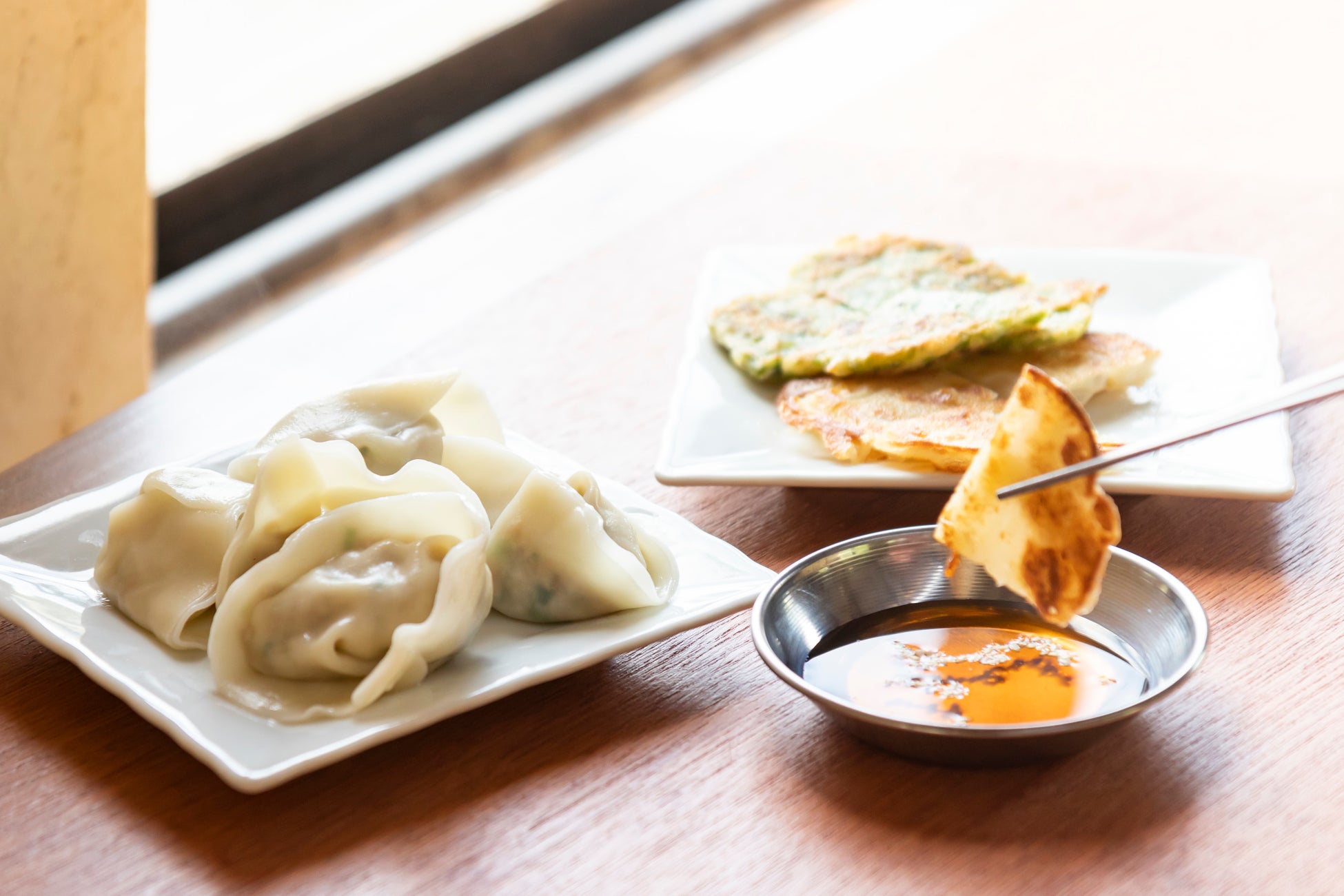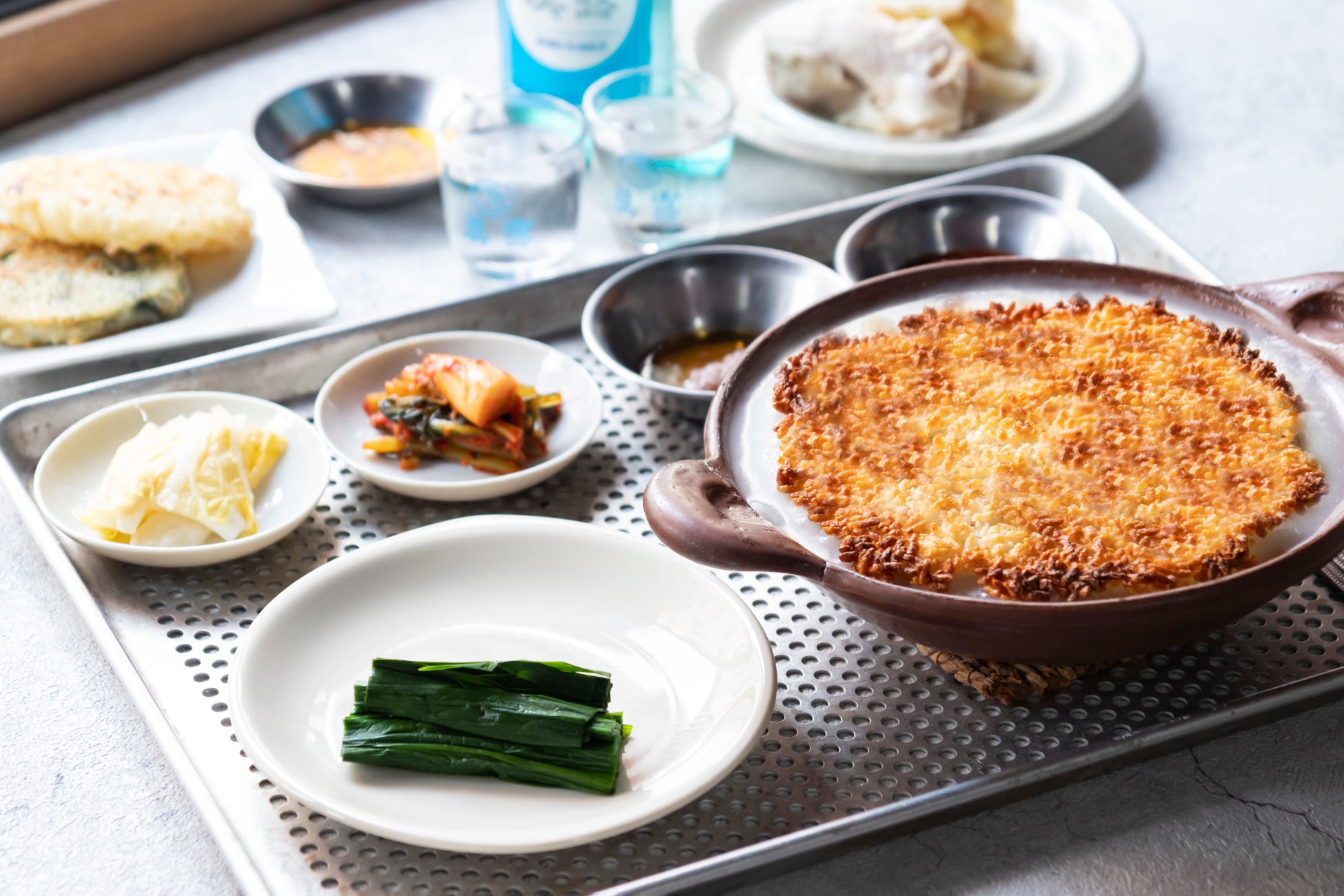 日本で言うチヂミです。チヂミという呼び方は韓国南部の方言で、他の地域ではジョンと呼ばれたりしています。淡路産しらすとあおさ海苔・淡路玉ねぎのジョンを2種盛り合わせで提供いたします。