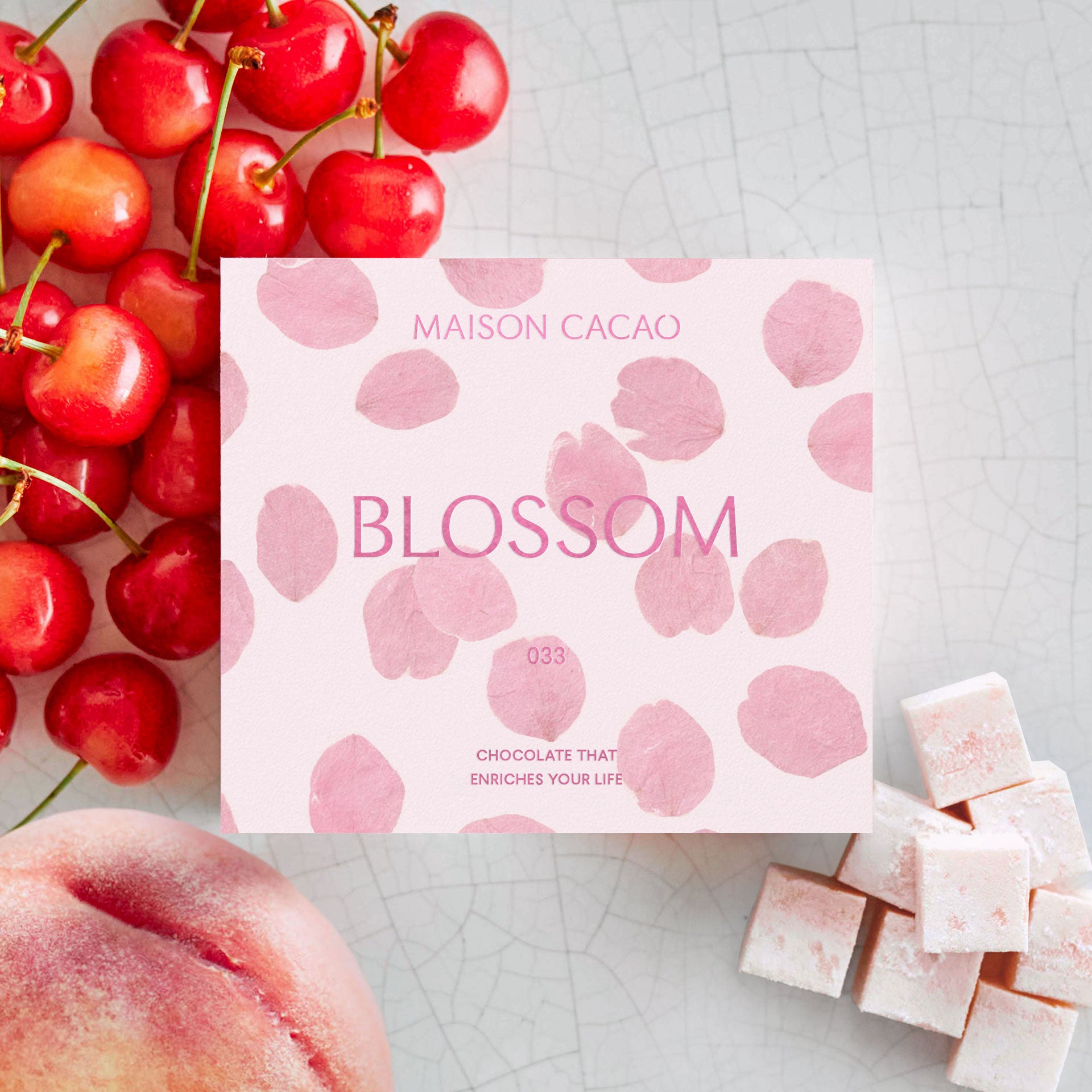 美しく幸せに花咲くよう、願いを込めた特別な味わい。愛情をたっぷりと注いで育った濃厚な甘みの川中島白桃と、宝石のように輝くさくらんぼ、佐藤錦を合わせました。優しくおいしさを引き立てる、ピュアホワイトチョコレートを添えて。