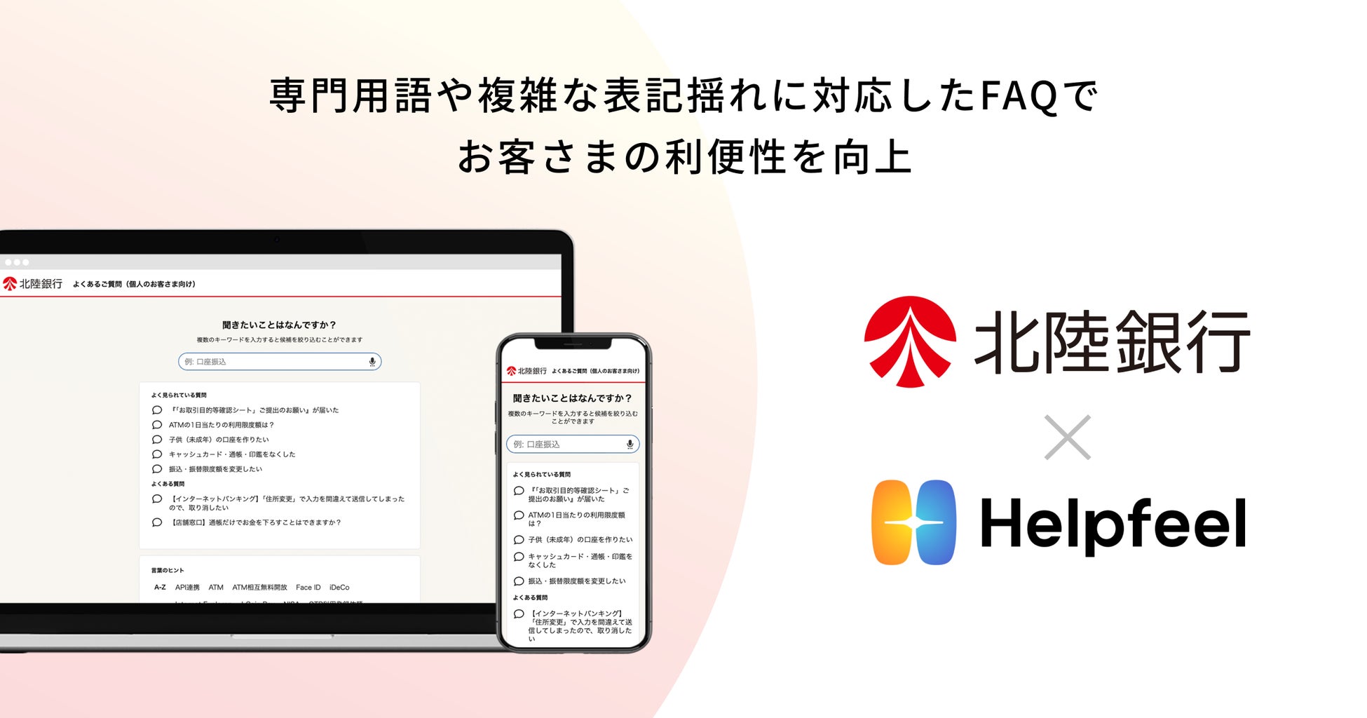 株式会社Helpfeel(京都府京都市、代表取締役/CEO:洛西 一周、以下 当社)は、株式会社北陸銀行(富山県富山市、代表取締役頭取:中澤 宏、以下 北陸銀行)のWebサイトに個人のお客さま向けFAQとして、カスタマーサポートの負荷を削減できる検索型AI-FAQ「Helpfeel(ヘルプフィール)」を導入いただいたことをお知らせいたします。