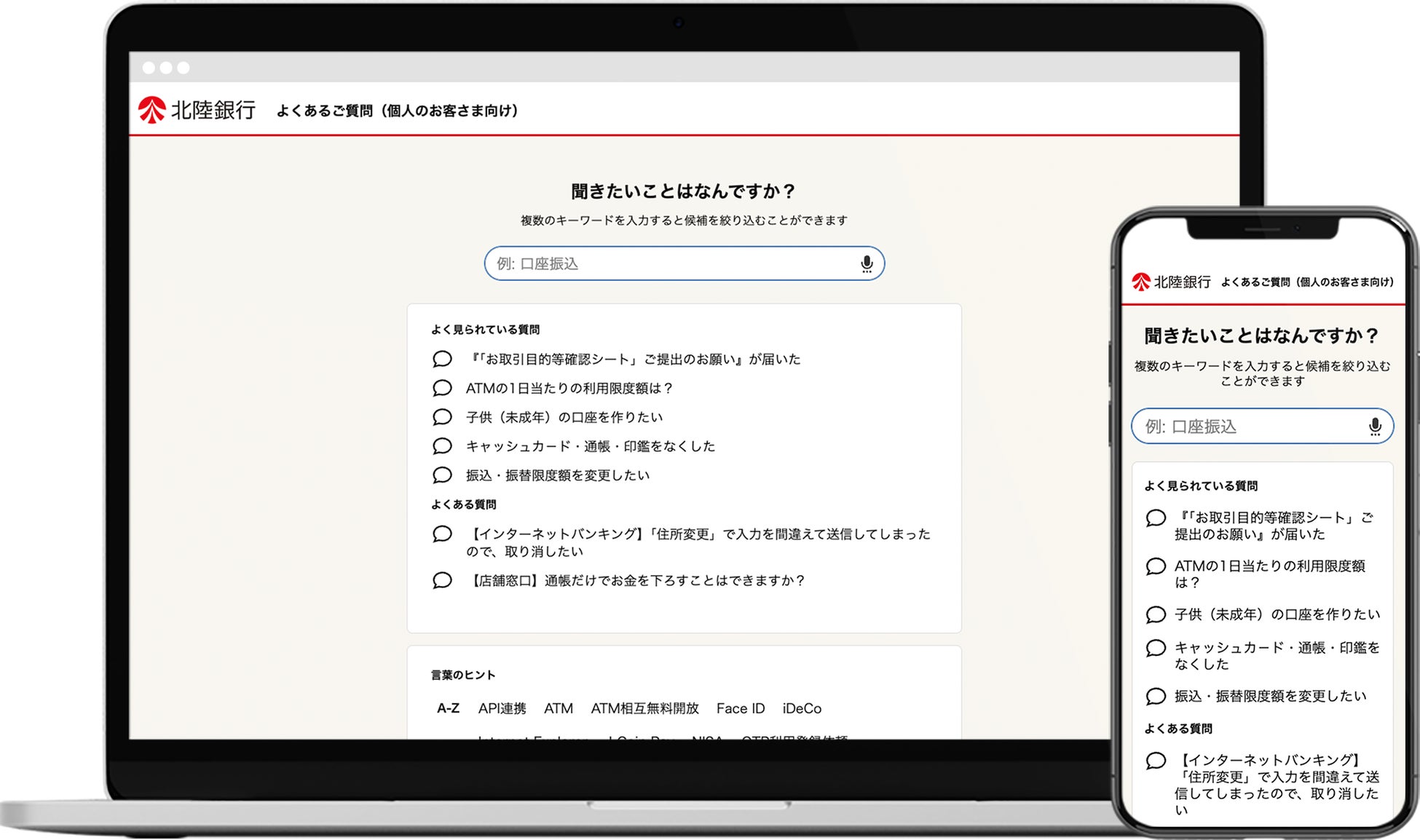 北陸銀行では、2023年10月より法人向けFAQ、同年同月より行内FAQ、2024年1月より令和6年能登半島地震対応の専用FAQで「Helpfeel」を運用していただいております。北陸銀行はこの3環境のFAQ運用を通して「Helpfeel」の専門用語や複雑な表記揺れに対応できる検索性と、サポート体制を評価し、個人のお客さま向けのFAQとして4環境目となる「Helpfeel」の導入を決定し、運用を開始いたしました。