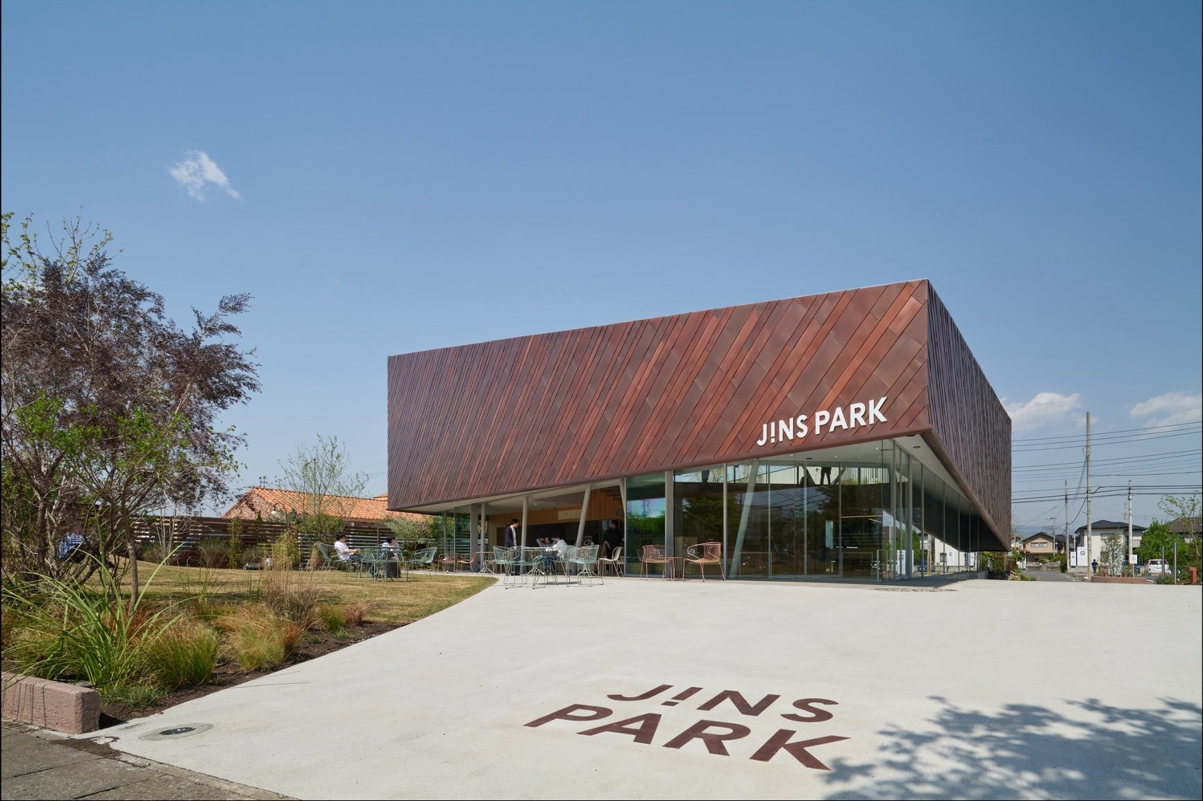 JINS創業の地、群⾺県前橋市にある地域コミュニティのハブとなることを⽬指した施設「JINS PARK(ジンズ パーク)」。アイウエアブランド「JINS」と、飲⾷事業として展開するベーカリーカフェ「エブリパン」の店舗を施設内に併設。誰もが⾃由に使⽤できる屋外広場や、施設内にも⼤階段や屋上テラスなど広々とした空間を設けることで、地域に新しい交流が⽣まれる場をつくるなど、JINSが地域と共⽣することを⽬指した店舗形態です。
