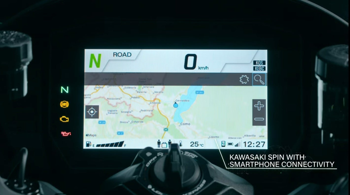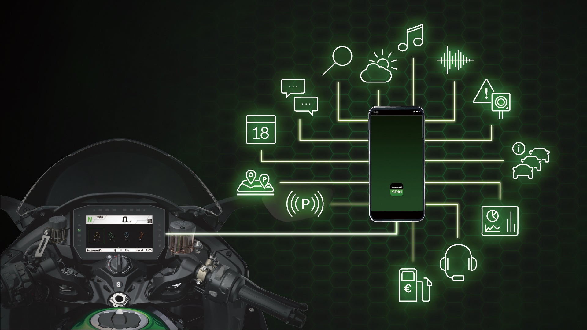 ・電話、音楽、ナビゲーションなどのスマートフォン用アプリをインストゥルメントパネルに表示・操作することが可能な新しいインフォテイメントアプリ「Kawasaki SPIN」