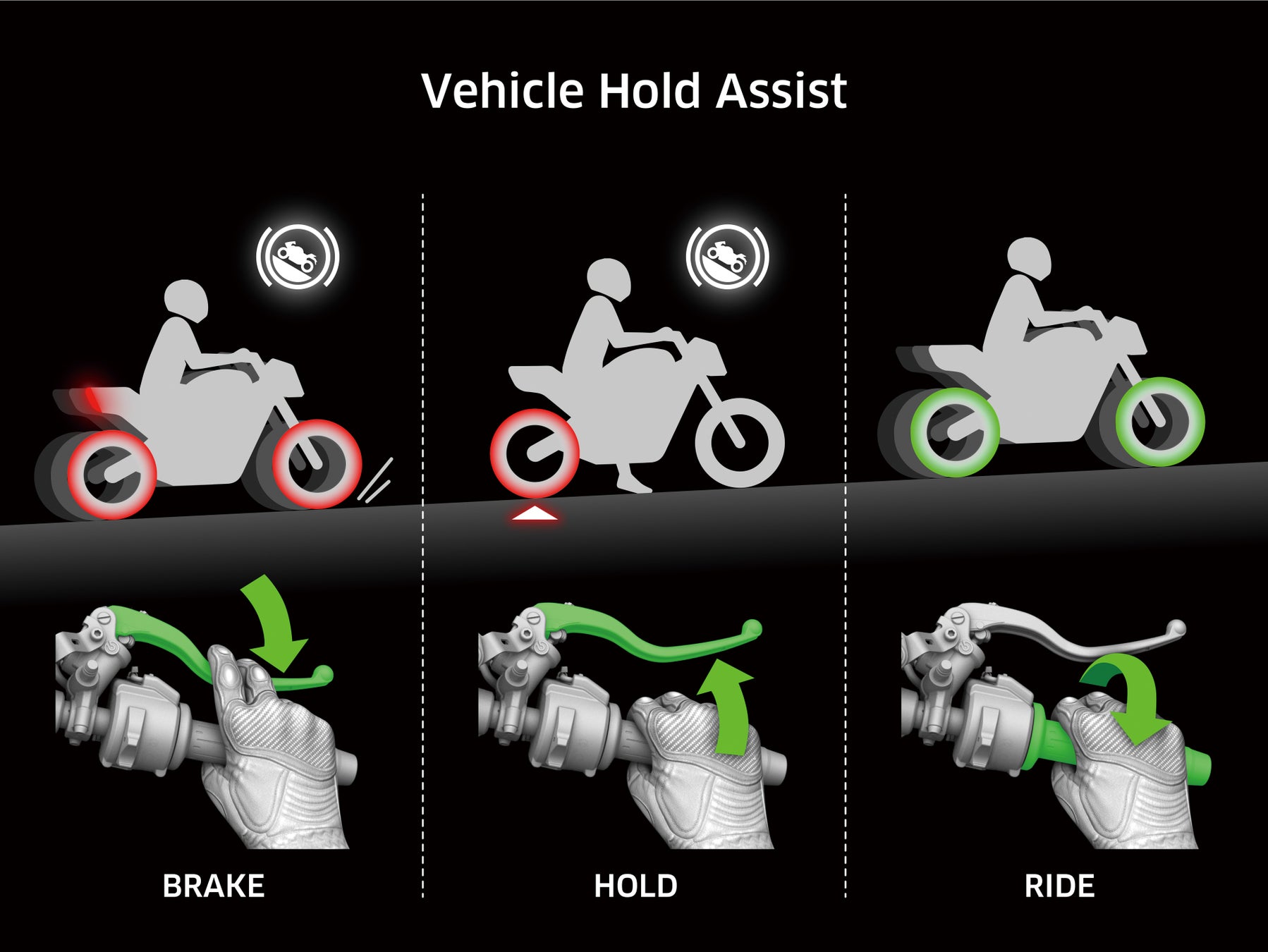 ・停止時に、ライダーのブレーキ入力無しでもブレーキ効力を維持するVHA(ビークルホールドアシスト)