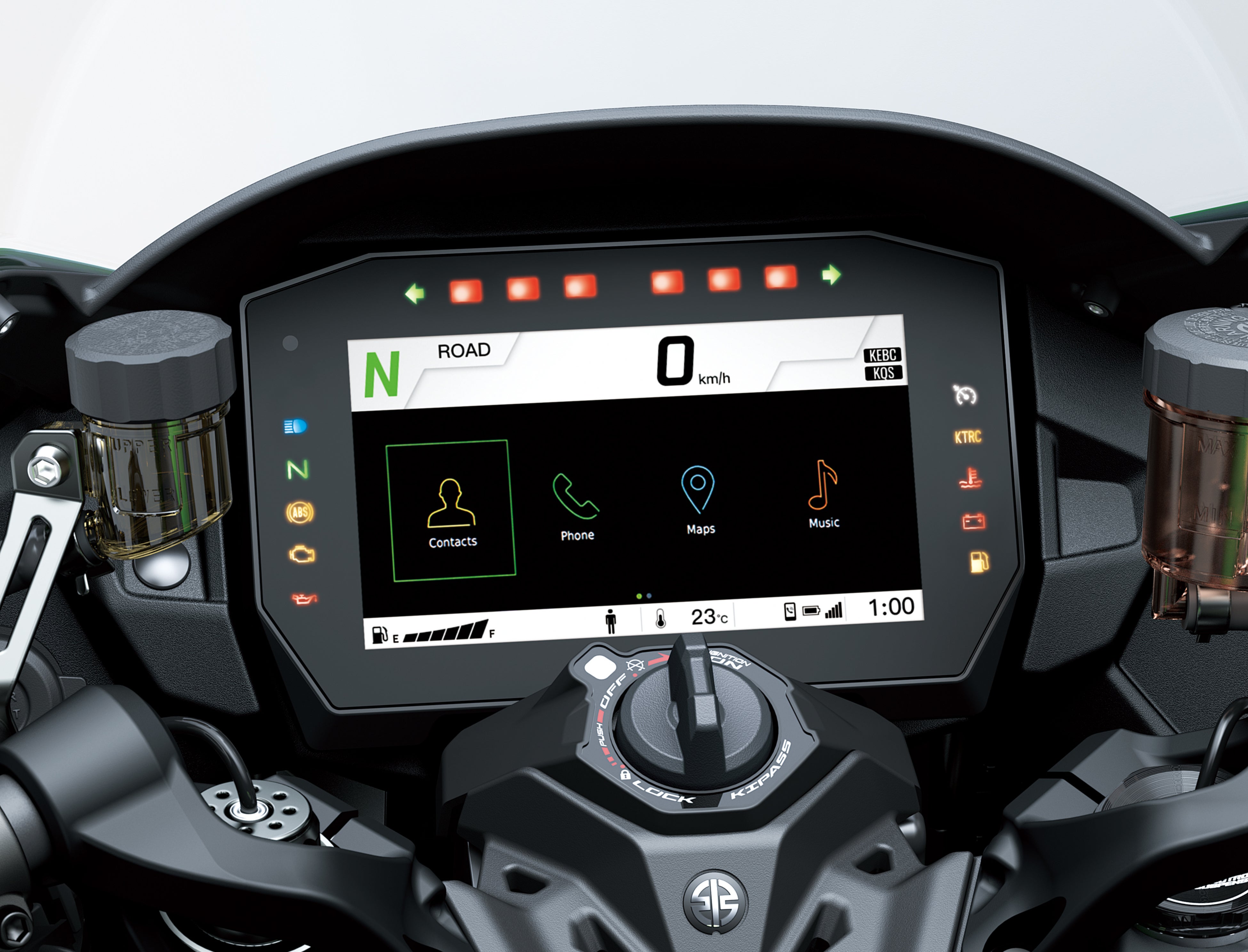 スーパーチャージドエンジンによる究極の性能と、ロングツーリングのための快適性を追求したハイパフォーマンススポーツツアラーNinja H2 SX。特有の強烈な加速力と扱いやすさを両立したこのモデルは、これまでのツーリングの概念を覆す程のパフォーマンスと魅力に溢れています。新たに搭載されたボッシュ社のARAS(アドバンスト・ライダー・アシスタンス・システム)は、快適性と利便性を向上。さらにVHA(ビークルホールドアシスト)やESS(エマージェンシーストップシグナル)といった新機能も、カワサキ車として初搭載しています。インストゥルメントパネルには、大きく見やすい6.5インチのフルカラーTFT液晶スクリーンを採用。従来からのスマートフォン連携に加え、新しいインフォテイメントアプリ「Kawasaki SPIN」により、電話、音楽、ナビゲーションなどのサードパーティ製アプリケーションを液晶スクリーンに表示、操作することができます。