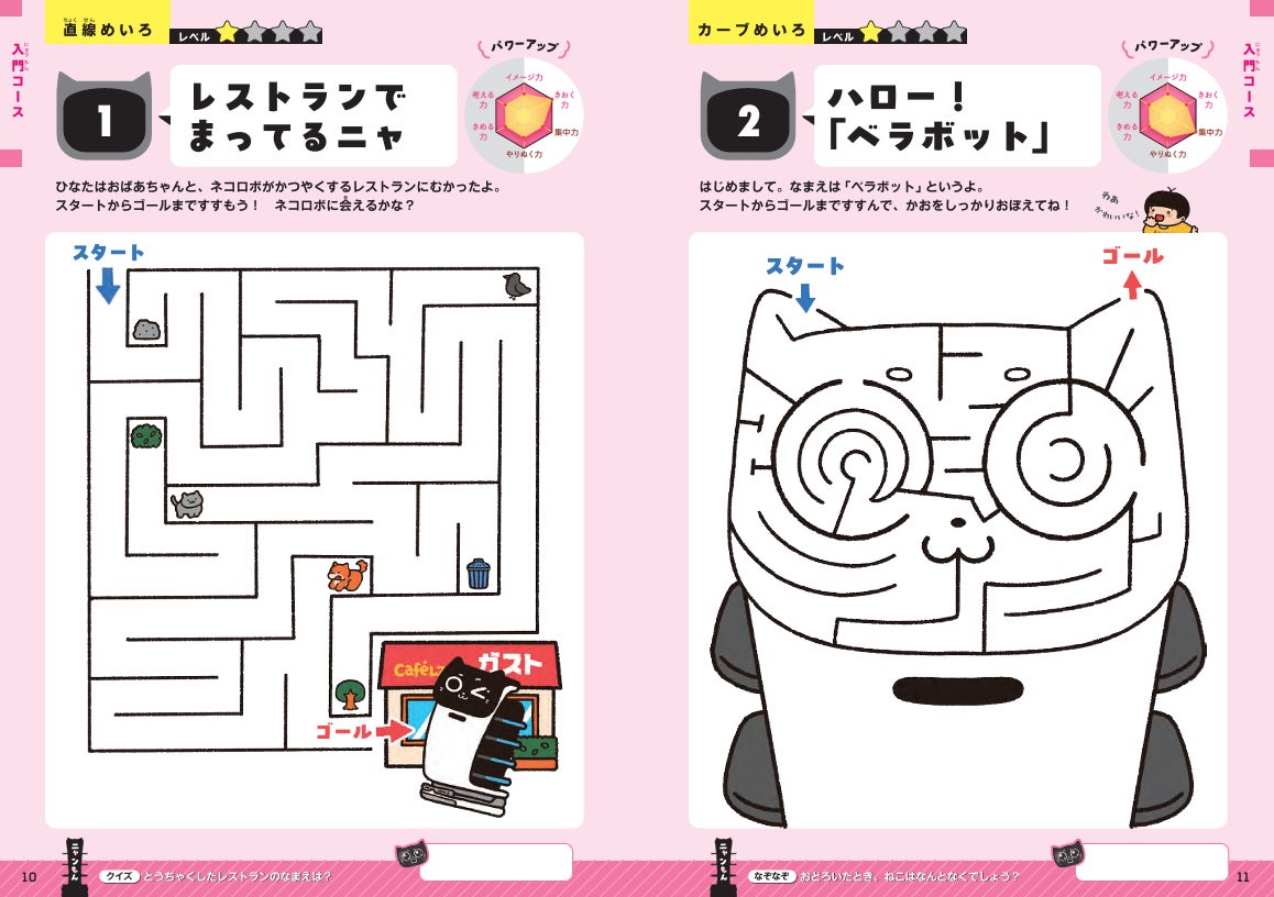 ファミレスでおなじみ!ネコ型配膳ロボット「べラボット」がめいろブックに。あそんで学べて脳が育つ、『頭がよくなるニャ ベラボットのルンルンめいろ』は4月28日(月)発売!おなじみのあのお店も登場。