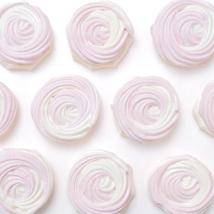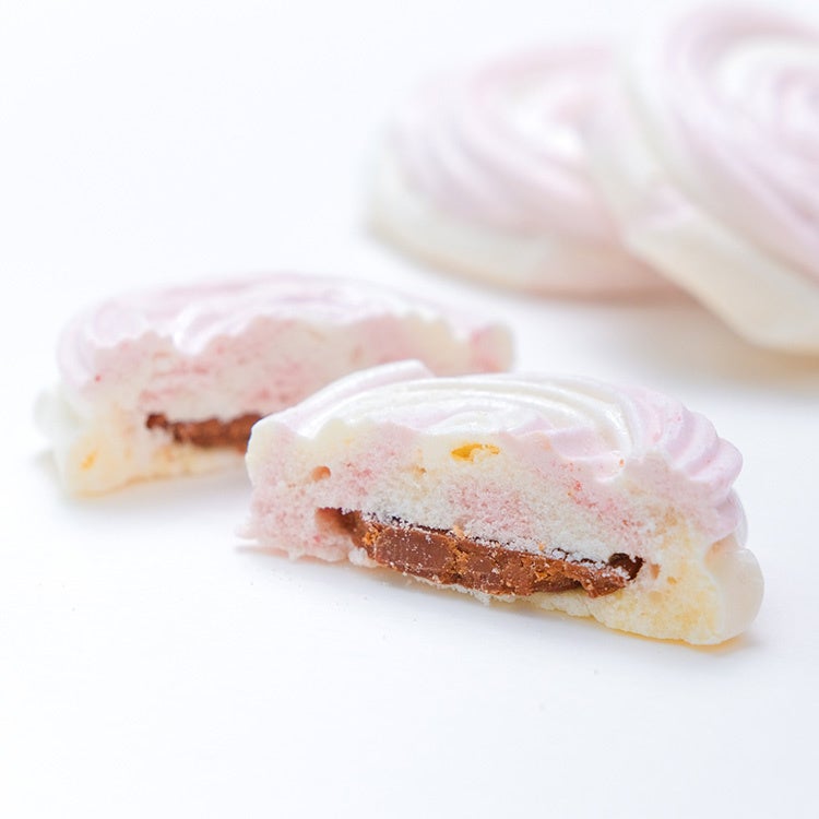 着色料を使わず苺パウダーで色づけたやさしいピンクと、 ほろっと軽いメレンゲの中から現れるチョコの甘みがうれしい小さなおやつです。