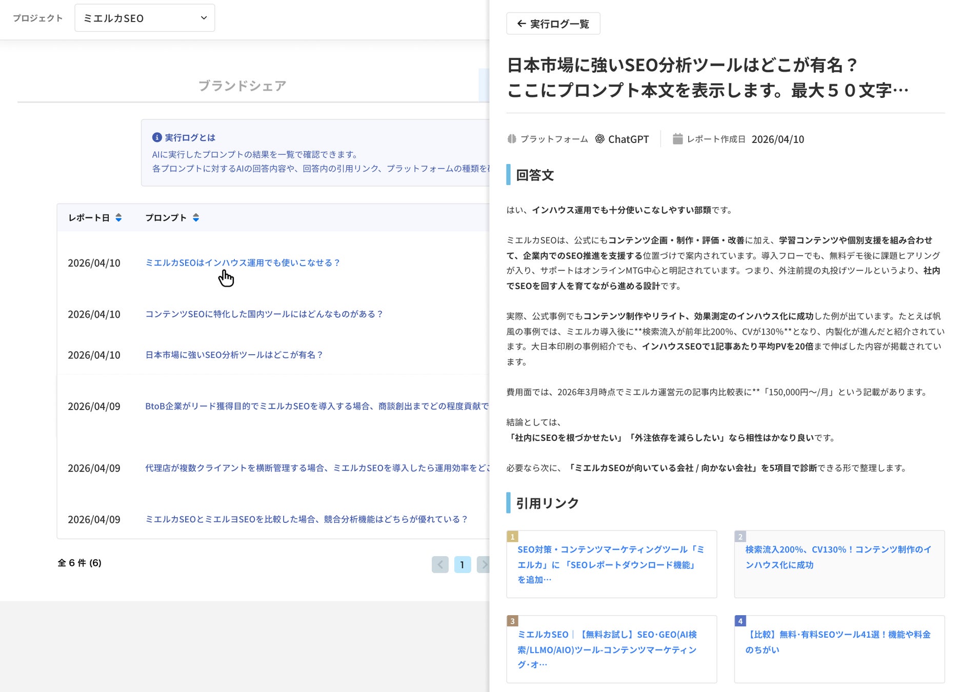 実際に生成した回答テキストをそのままログとして保存します。自社がどのように紹介されているのかといった一次情報を、いつでも詳細に検証することが可能です 。