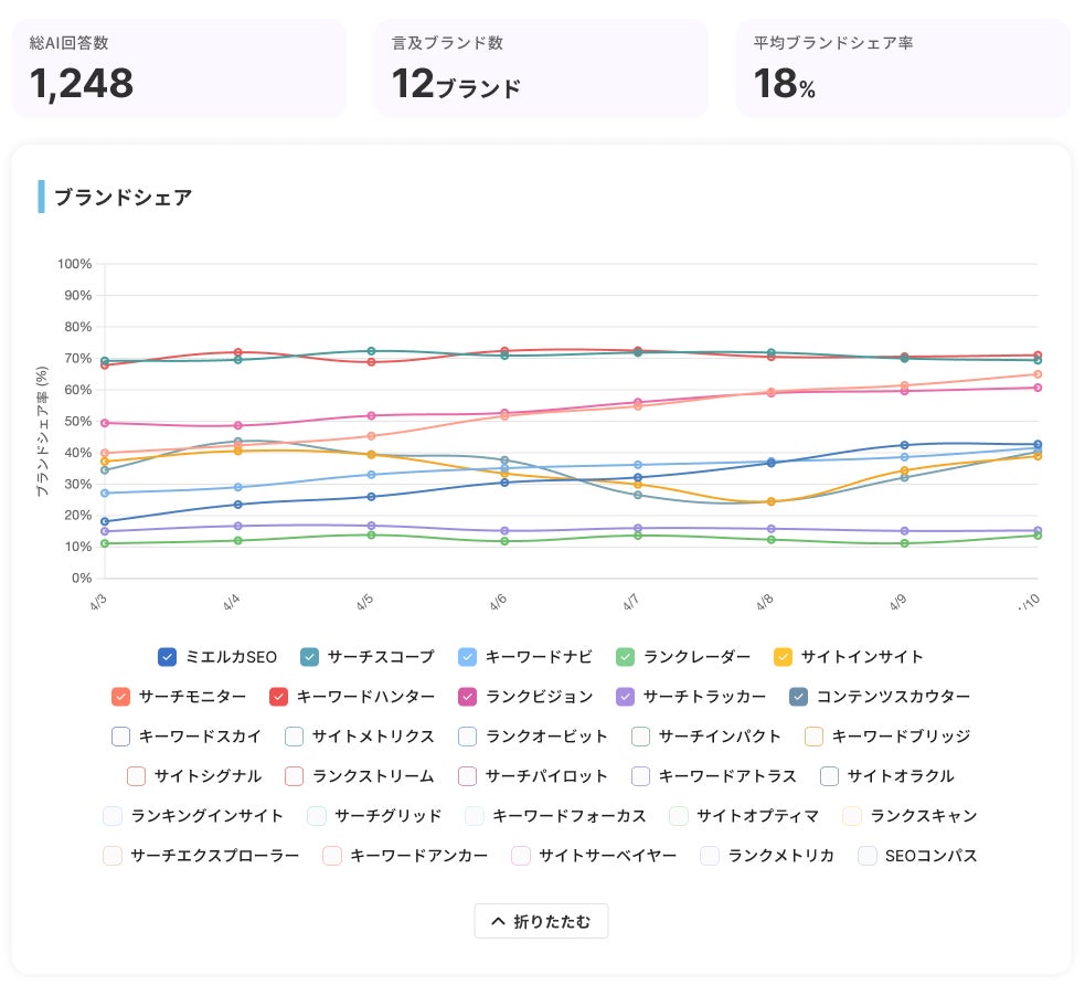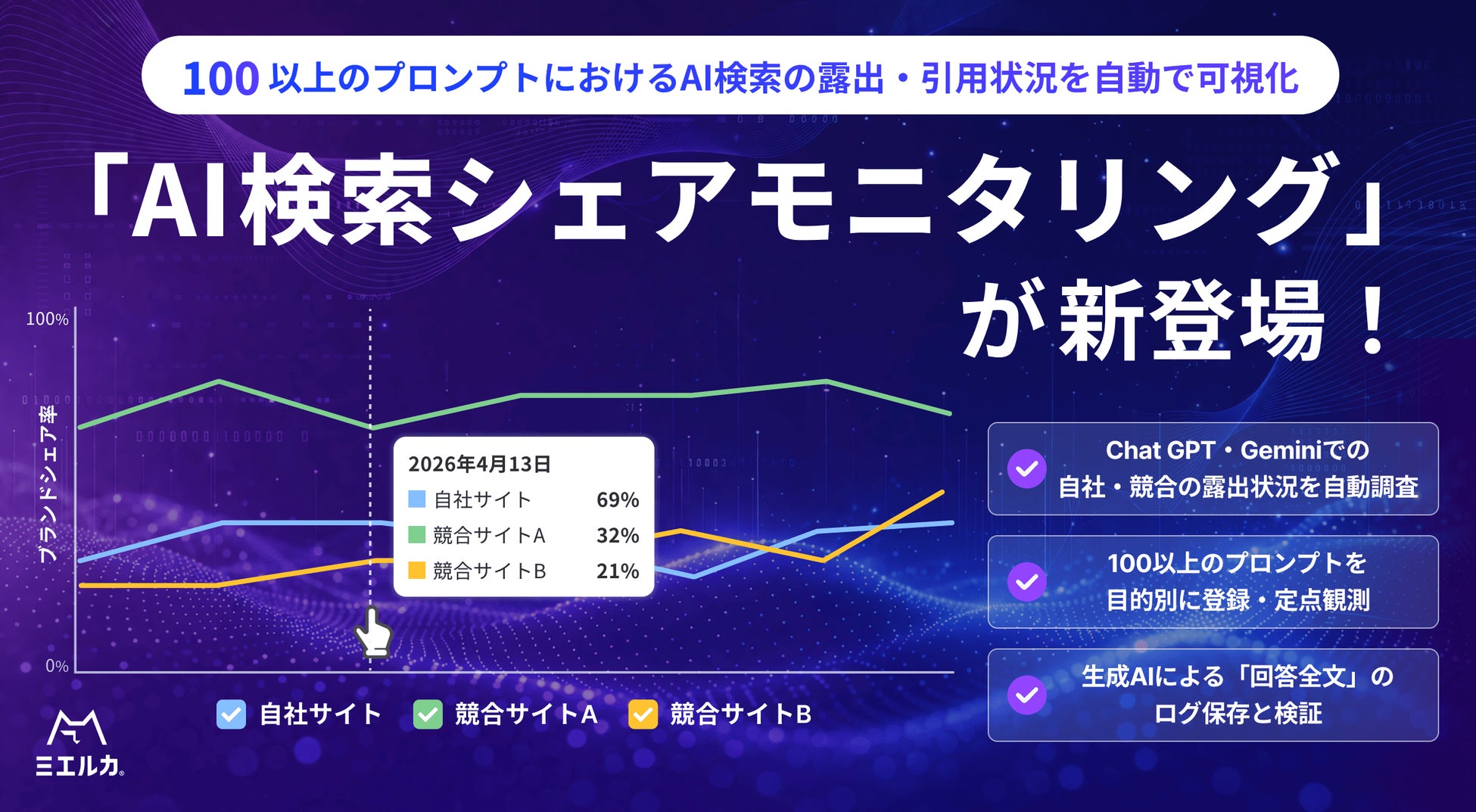 AI検索での自社・競合ブランド露出を定点調査可能!「ミエルカGEO」と「ミエルカSEO」に新機能「AI検索シェアモニタリング」を搭載