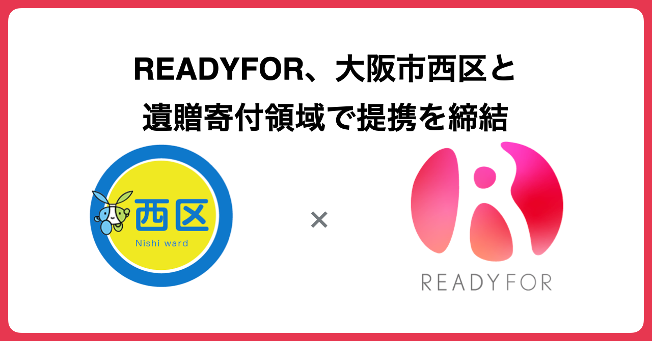 READYFOR株式会社(所在地:東京都千代田区、代表:米良はるか、以下:当社)は、大阪市西区(区長:三村浩也)と地域課題の解消および区民サービスの向上を目的とした包括連携協定ならびに遺贈寄付サポートにかかる契約を締結いたします。