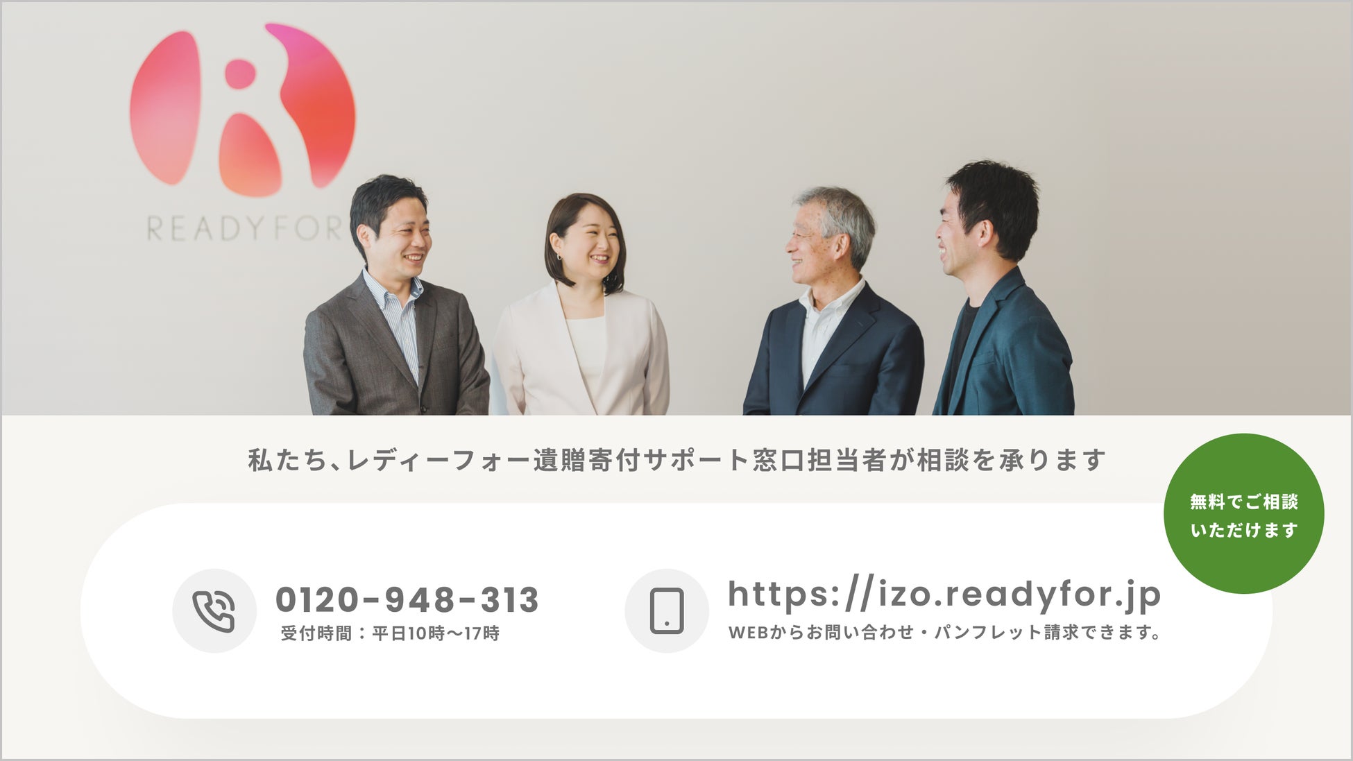 ・「レディーフォー遺贈寄付サポート窓口」ページ:https://izo.readyfor.jp/