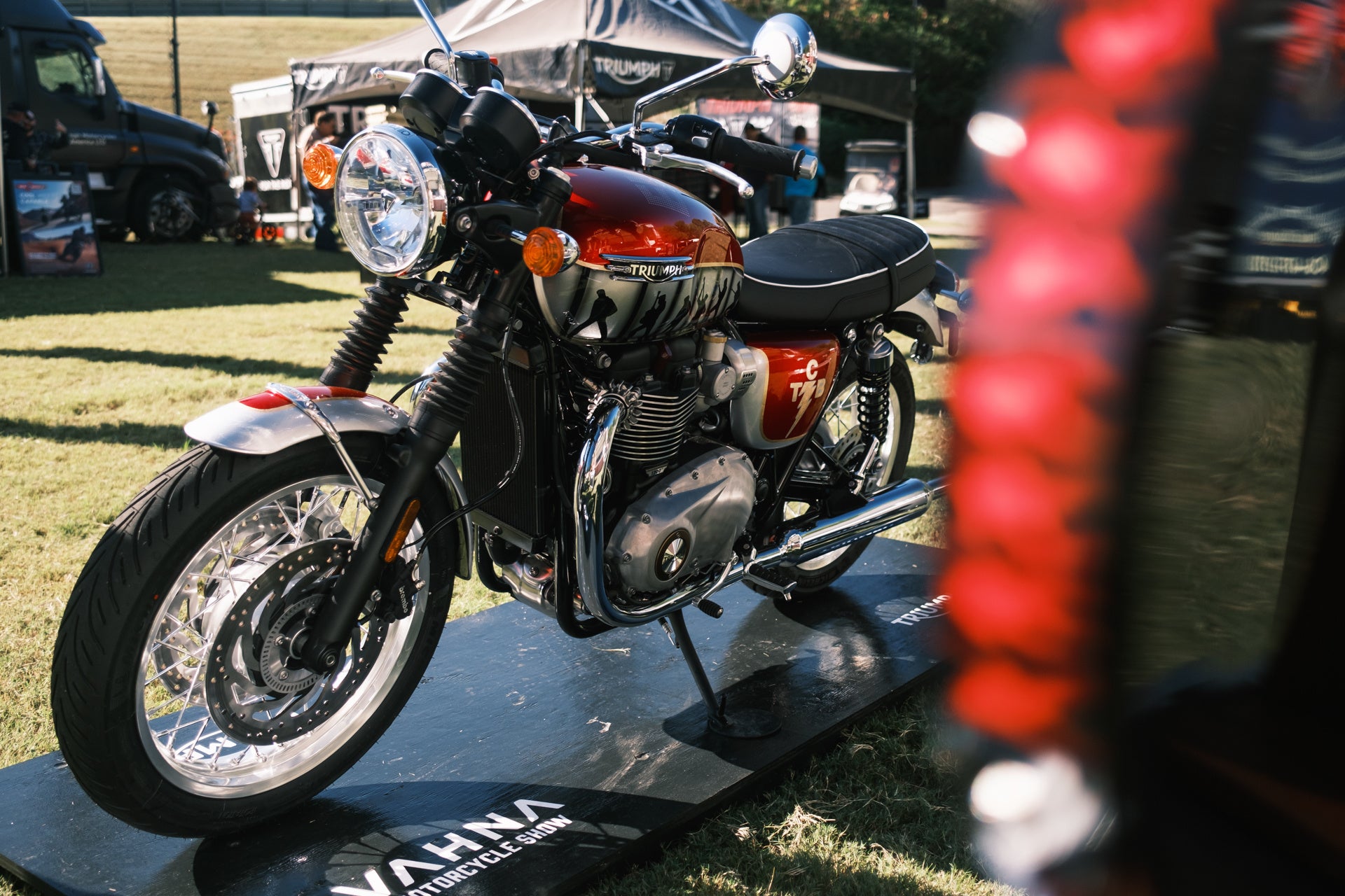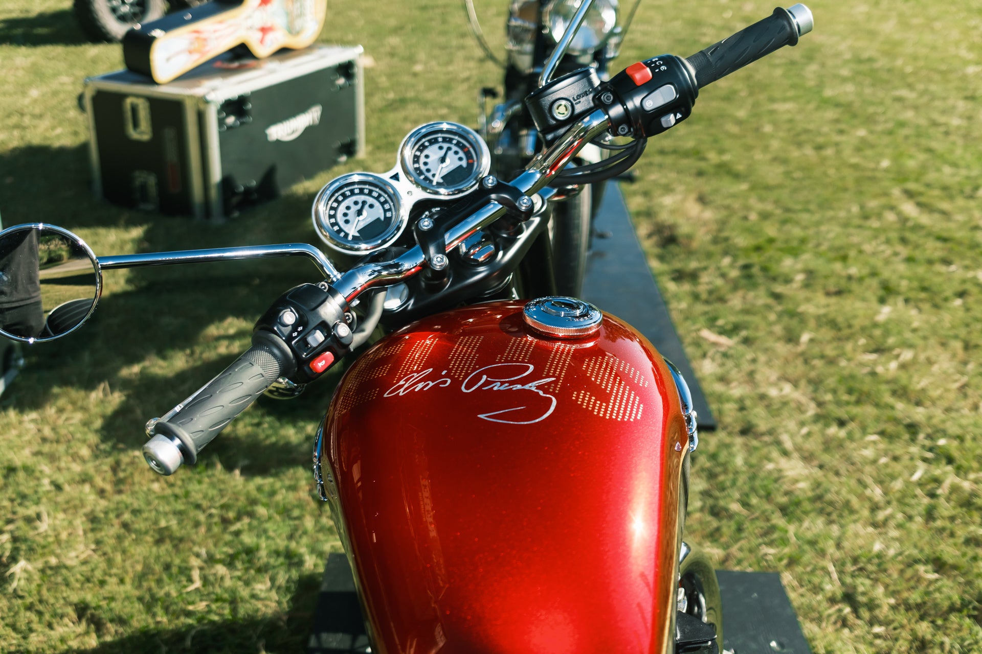 このバイクは、アラバマ州バーミンガムで開催された『2023年 バーバーヴィンテージモーターサイクルフェスティバル』にて、トライアンフUSAのマーケティングディレクター、アダム・ヴァンダーヴィーンが発表しました。エルヴィスが購入した同世代の1965年製Bonneville のオリジナルを含む、数々の歴史的なトライアンフとともにバーバーモータースポーツミュージアムから貸し出され、『Isle of Triumph』に展示されました。
