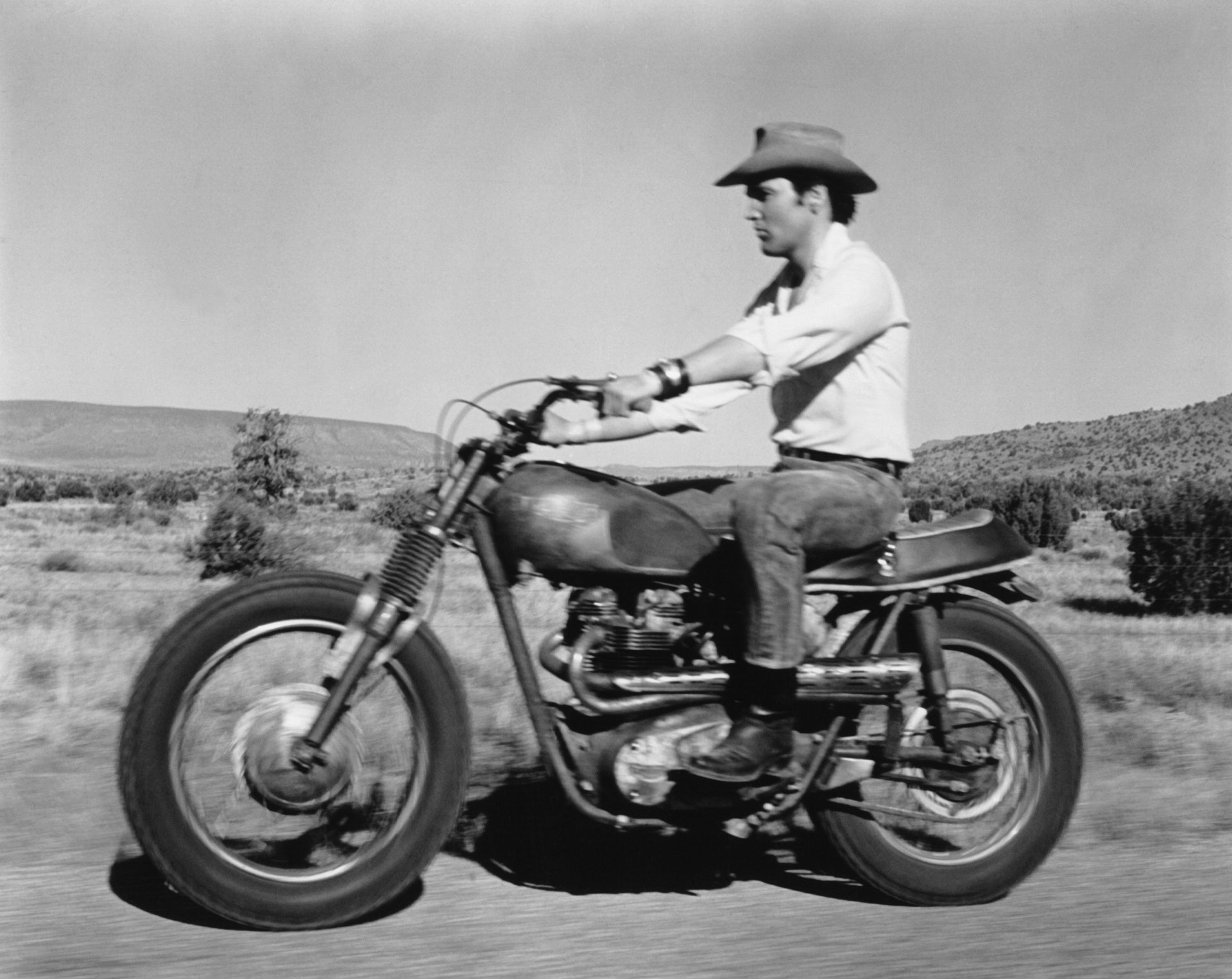 歴史上最大のセールスを記録したソロアーティスト、ハリウッドで31本の映画に出演した映画スターでもあることが、それを物語っています。そしてエルヴィスは無類のバイク愛好家でもあり、映画の中でもバイクを乗りこなしています。例えば、1968年のコメディウエスタン映画『Stay Away Joe』では、レッドとシルバーのTriumph 650 Bonneville「Desert Sled」に乗っているシーンがあります。